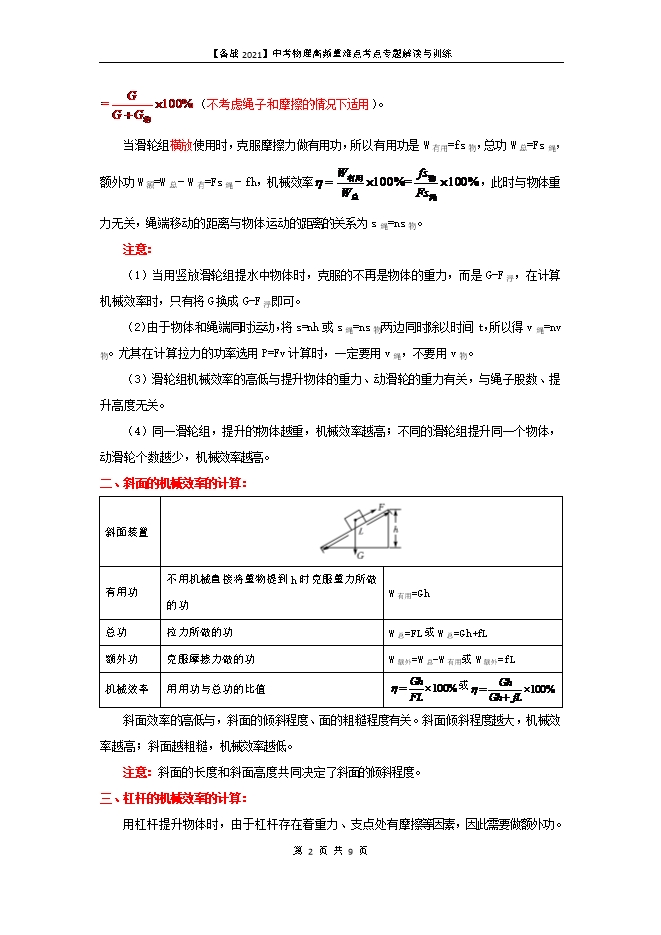 【内容简介】机械效率是初中物理力学中重要的知识点,是中考中必考的知识点之一。机械效率知识综合性强,学生考试中普遍感觉较难,很多学生往往是机械的模仿,一味的套公式,不理解公式成立的条件,出错率偏高。 一、机械效率1、三功——有用功、额外功、总功有用功我们需要的、必须要做的功叫做有用功,用W有用表示。额外功使用机械时并非我们需要但又不得不做的功叫做额外功,用W额表示。总功有用功与额外功之和是总共做的功,叫做总功,用W总表示,用公式表达为W总=W有+W额2、机械效率(1)定义:物理学中,把有用功跟总功的比值叫做机械效率,用η表示。(2)公式: (3)提高机械效率的方法:增大重物、减小机械间的摩擦、减小机械自重、改进结构等。注意: 机械效率是一个比值,通常用百分数表示,由于有用功总小于总功,故机械效率总小于1;机械效率的高低与使用机械是省力还是费力无关。二、滑轮组机械效率的计算:(物体匀速运动)当滑轮组竖放使用时,克服物体重力做有用功,所以有用功是W有用=Gh,总功W总=Fs,额外功W额=W总-W有=Fs-Gh,机械效率 (任何情况下都适用);如果不计绳重和摩擦,额外功W额=G动h,机械效率 (不考虑绳子和摩擦的情况下适用)。当滑轮组横放使用时,克服摩擦力做有用功,所以有用功是W有用=fs物,总功W总=Fs绳,额外功W额=W总-W有=Fs绳-fh,机械效率 ,此时与物体重力无关,绳端移动的距离与物体运动的距离的关系为s绳=ns物。注意:(1)当用竖放滑轮组提水中物体时,克服的不再是物体的重力,而是G-F浮,在计算机械效率时,只有将G换成G-F浮即可。(2)由于物体和绳端同时运动,将s=nh或s绳=ns物两边同时除以时间t,所以得v绳=nv物。尤其在计算拉力的功率选用P=Fv计算时,一定要用v绳,不要用v物。(3)滑轮组机械效率的高低与提升物体的重力、动滑轮的重力有关,与绳子股数、提升高度无关。(4)同一滑轮组,提升的物体越重,机械效率越高;不同的滑轮组提升同一个物体,动滑轮个数越少,机械效率越高。二、斜面的机械效率的计算:斜面装置 有用功不用机械直接将重物提到h时克服重力所做的功W有用=Gh总功拉力所做的功W总=FL或W总=Gh+fL额外功克服摩擦力做的功W额外=W总-W有用或W额外=fL机械效率用用功与总功的比值 或 斜面效率的高低与,斜面的倾斜程度、面的粗糙程度有关。斜面倾斜程度越大,机械效率越高;斜面越粗糙,机械效率越低。注意:斜面的长度和斜面高度共同决定了斜面的倾斜程度。三、杠杆的机械效率的计算:用杠杆提升物体时,由于杠杆存在着重力、支点处有摩擦等因素,因此需要做额外功。对提升物体所做的功为有用功,即W有用=Gh,拉力所做的功为总功,即W总=Fs,所以杠杆的机械效率 。s、h的关系可以通过动力臂与阻力臂的关系求得。 一、中考题型分析在中考试卷中,侧重滑轮组机械效率的计算,有时结合浮力、功率一起考查,综合性强。斜面的机械效率则侧重考查有用功、总功、机械效率的计算。中考中,主要以填空题、选择题、计算题形式考查,分值在2分—6分左右。