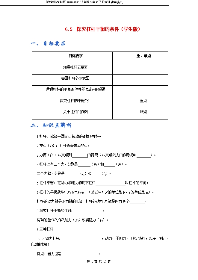 6.5探究杠杆平衡的条件--【教育机构专用】2020-2021沪粤版八年级下册物理辅导讲义(学生版和教师版)