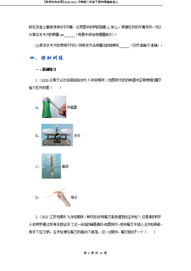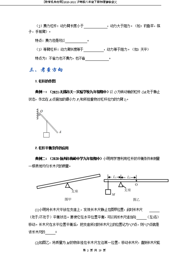 【内容简介】一、目标要求目标要求重、难点知道杠杆五要素会画杠杆的示意图理解杠杆的平衡条件并能灵活运用解题探究杠杆的平衡条件重点关于杠杆的作图难点二、知识点解析1.杠杆:能绕一固定点转动的硬棒叫杠杆。2.支点(O):杠杆绕着转动的点。3.力臂(l):从支点到_________的距离(从支点向力的作用线画________)。4.杠杆上有二个力,分别是_______(F1)和______(F2)。二个力臂,分别是________(l1)和_____(l2)。5.杠杆平衡:在动力和阻力作用下杠杆_________________叫杠杆的平衡。6.杠杆的平衡条件:F1•l1=F2•l2 (公式中:F的单位是N,l的单位是m)。杠杆的动力臂是阻力臂的几倍,杠杆的动力F1就是阻力F2的________。7.探究杠杆平衡条件时:________________。钩码的重作为作为动力(F1)或者阻力(F2)。8.三种杠杆(1)省力杠杆:_______________________,动力小于阻力。(如:撬杠,起子,铡刀,手动抽水机)特点:省力但是_____________________。(2)费力杠杆:动力臂长度小于______________,动力大于阻力。(如:钓鱼竿,筷子,手前臂)。特点:费力但是可以_____________。(3)等臂杠杆:动力臂长度等于____________,动力等于阻力。(如:天平)特点为:不省力也不费力,也不省______________。三、考查方向1.杠杆的作图典例一:(2021•无锡市天一实验学校九年级期中)以O为转动轴的杠杆OA处于静止状态,作出在A点施加的最小力F1和所挂重物对杠杆拉力的力臂l2。 2.杠杆平衡条件的应用典例二:(2020•扬州市梅岭中学九年级期中)小明同学想利用杠杆的平衡条件来测量一根质地均匀长木尺的质量。 (1)小明将长木尺平放在支座上,发现长木尺静止在图甲位置,此时长木尺 ______(处于/不处于)平衡状态。要使它在水平位置平衡,可以将长木尺适当向______(左/右)移动。长木尺在水平位置平衡后,把支座所对的长木尺上的位置记为“O”点,则“O”点就是该长木尺的______;(2)如图乙,将质量为M的物体挂在长木尺左边某一位置,移动长木尺,直到长木尺能够在支座上重新保持水平平衡,记录图中的两段距离L1和L2。根据杠杆的平衡条件,可以计算出长木尺的质量m=______(用题中所给物理量表示);(3)若该长木尺的质地不均匀,则用该方法测量出的结果将______(仍然准确/不准确)。四、模拟训练一、基础练习1.(2020•云南文山壮族苗族自治州•八年级期末)如图所示的四种器材正常使用时属于省力杠杆的是( )A. 开瓶器B. 天平C. 船桨D. 筷子2.(2021•江苏无锡市•九年级期末)有网友说“用餐叉能快速剥出玉米粒”,这是真的吗?小波同学通过亲身实践证实了这一说法的确是真的。如图所示,他将餐叉平插入玉米粒根部,用手下压叉柄,玉米粒便在餐叉的撬动下脱落,这一过程中,餐叉相当于一个( )