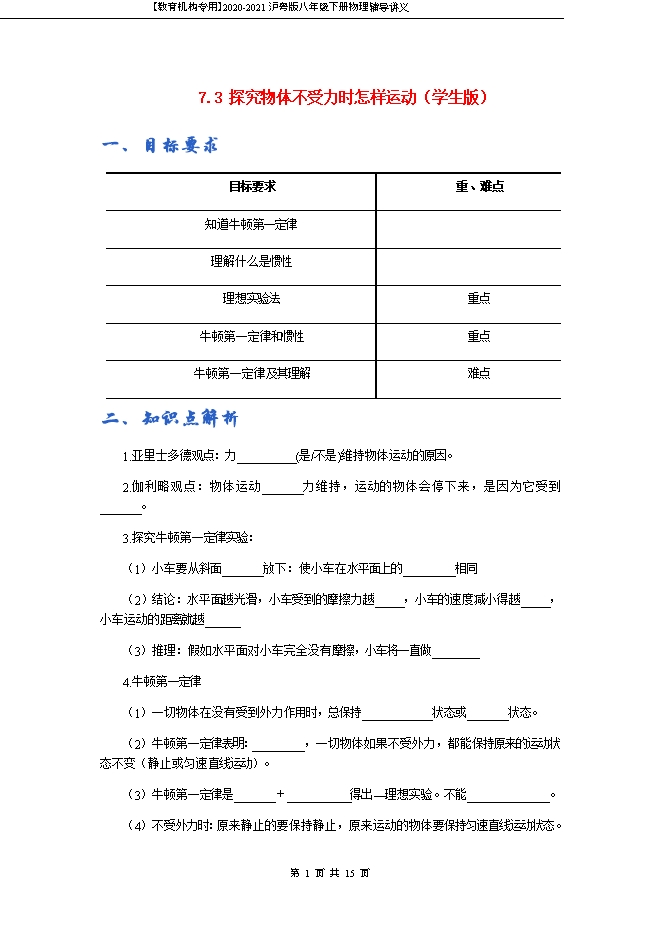 7.3探究物体不受力时怎样运动--【教育机构专用】2020-2021沪粤版八年级下册物理辅导讲义(学生版和教师版)