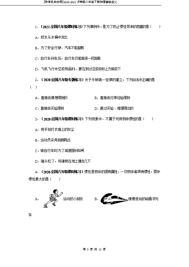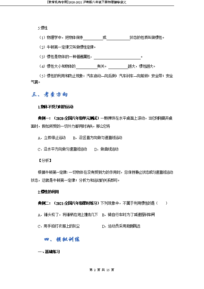 【内容简介】一、目标要求目标要求重、难点知道牛顿第一定律理解什么是惯性理想实验法重点牛顿第一定律和惯性重点牛顿第一定律及其理解难点二、知识点解析1.亚里士多德观点:力__________(是/不是)维持物体运动的原因。2.伽利略观点:物体运动_______力维持,运动的物体会停下来,是因为它受到_______。3.探究牛顿第一定律实验:(1)小车要从斜面_______放下:使小车在水平面上的_________相同(2)结论:水平面越光滑,小车受到的摩擦力越_____,小车的速度减小得越_____,小车运动的距离就越______(3)推理:假如水平面对小车完全没有摩擦,小车将一直做________4.牛顿第一定律(1)一切物体在没有受到外力作用时,总保持____________状态或_______状态。(2)牛顿第一定律表明:_________,一切物体如果不受外力,都能保持原来的运动状态不变(静止或匀速直线运动)。(3)牛顿第一定律是_______+___________得出—理想实验。不能______________。(4)不受外力时:原来静止的要保持静止,原来运动的物体要保持匀速直线运动状态。5.惯性(1)物理学中,把物体保持___________或_____________状态的性质叫做惯性。(2)牛顿第一定律又叫做惯性定律。(3)惯性是物体的一种普遍属性,__________________________。(4)惯性大小和物体的____________有关。___________越大,惯性越大。(5)惯性的利用和防止现象:汽车启动—向后倒;汽车刹车—向前倾;安全带;安全气囊。三、考查方向1.物体不受力时的运动典例一:(2020•全国八年级单元测试)一颗弹珠在水平桌面上滚动,当它刚刚离开桌面时,假如所受的一切外力都同时消失,那么它将A.立即停止运动 B.沿竖直方向做匀速直线运动C.沿水平方向做匀速直线运动 D.做曲线运动【分析】根据牛顿第一定律:一切物体在没有受到力的作用时,总保持静止状态或匀速直线运动状态,这就是牛顿第一定律;分析力和运动的关系即可。2.惯性的利用典例二:(2021•全国八年级课时练习)下列现象中,不属于利用惯性的是( )A.锤头松了,将锤柄在地上撞击几下B.骑自行车时为了减速捏刹车闸C.用手拍打衣服上的灰尘D.运动员采用助跑跳远四、模拟训练一、基础练习1.(2021•全国八年级课时练习)下列事例中,是为了防止惯性带来的危害的是( )A.把水从水桶中泼出B.为了安全行驶,汽车不能超载C.自行车刹车后,自行车仍能前进一段距离D.飞机飞行中空投物品时,要在到达空投目标上方前投下2.(2020•全国八年级专题练习)关于牛顿第一定律的建立,下列说法中正确的是( )A.直接由猜想得到的B.直接由日常经验得到C.直接由实验得到D.通过实验、推理得出的3.(2020•全国八年级课时练习)下列现象中,不属于利用物体惯性的是( )A.用手拍打衣服上的灰尘B.运动员采用助跑跳远C.骑自行车时为了减速捏刹车闸D.锤头松了,将锤柄在地上撞击几下