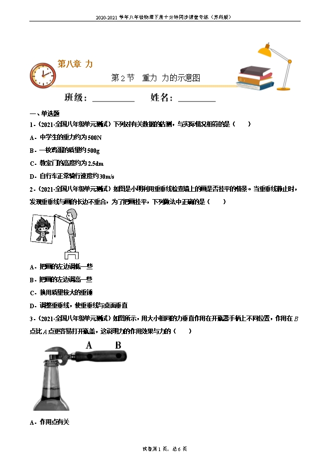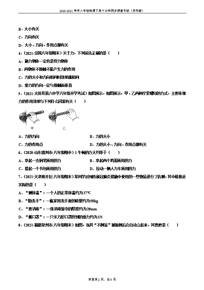 【内容简介】1.(2021•全国八年级单元测试)下列对有关数据的估测,与实际情况相符的是( )A.中学生的重力约为500NB.一枚鸡蛋的质量约500gC.教室门的高度约为2.5dmD.自行车正常骑行速度约30m/s【答案】A【详解】A.中学生质量约50kg,重力约500N,故A符合题意;B.一枚鸡蛋的质量约50g,故B不符合题意;C.教室门的高度约为2m,故C不符合题意;D.自行车正常骑行速度约5m/s,故D不符合题意。故选A。2.(2021•全国八年级单元测试)如图是小明利用重垂线检查墙上的画是否挂平的情景。当重垂线静止时,发现重垂线与画的长边不重合,为了把画挂平,下列做法中正确的是( ) A.把画的左边调低一些B.把画的左边调高一些C.换用质量较大的重锤D.调整重垂线,使重垂线与桌面垂直【答案】A【详解】重力的方向总是竖直向下的,如果这幅画的长边和重垂线是平行的,则画是竖直的(即放正),否则画不竖直;所以为了把画贴正,应调整画的位置,使画的长边与重垂线平行,也就是需要将画的左边调低一些,故A正确,BCD错误。故选A。3.(2021•全国八年级单元测试)如图所示,用大小相同的力垂直作用在开瓶器手柄上不同位置,作用在B点比A点更容易打开瓶盖,这说明力的作用效果与力的( ) A.作用点有关B.大小有关C.方向有关D.大小、方向、作用点都有关【答案】A【详解】由题意知,力的大小和方向相同,作用点A、B不同,在B点比A点更容易打开瓶盖,说明力的作用效果与力的作用点有关。故选A。4.(2021•全国八年级期末)关于力,下列说法正确的是( )A.施力物体一定也是受力物体B.两物体不接触不能产生力的作用C.力的大小和方向相同时效果就相同D.重力的方向一定与接触面垂直【答案】A【详解】A.一个物体对另一个物体施力的同时,也受到另一个物体对它的作用,所以一个物体是施力物体的同时,也是受力物体,故A正确;B.两个物体不接触也能产生力的作用,如磁铁吸引铁钉,故B错误;C.作用在物体上的力,只有力的大小、方向和作用点相同,力的作用效果才相同,故C错误;D.重力的方向一定竖直向下,不一定与接触面垂直,故D错误。故选A。5.(2021•大田县第六中学八年级开学考试)如图所示,如图所示,甲、乙两种拧紧螺母的方式,主要体现力的作用效果与下列什么因素有关( ) A.力的方向B.力的大小C.力的作用点D.力的大小、方向、作用点都有关【答案】C【详解】由图甲可图乙可知,手握住工具的不同位置,力的作用点不同,施加相同大小的力时转动的幅度不同,说明力的作用效果与力的作用点有关。故选C。6.(2020•山东德州市•八年级期中)1牛顿的力大约等于( )A.拿起一支钢笔所用的力B.拿起两个鸡蛋所用的力C.提起一个书包所用的力D.拉动一辆人力车所用的力【答案】B