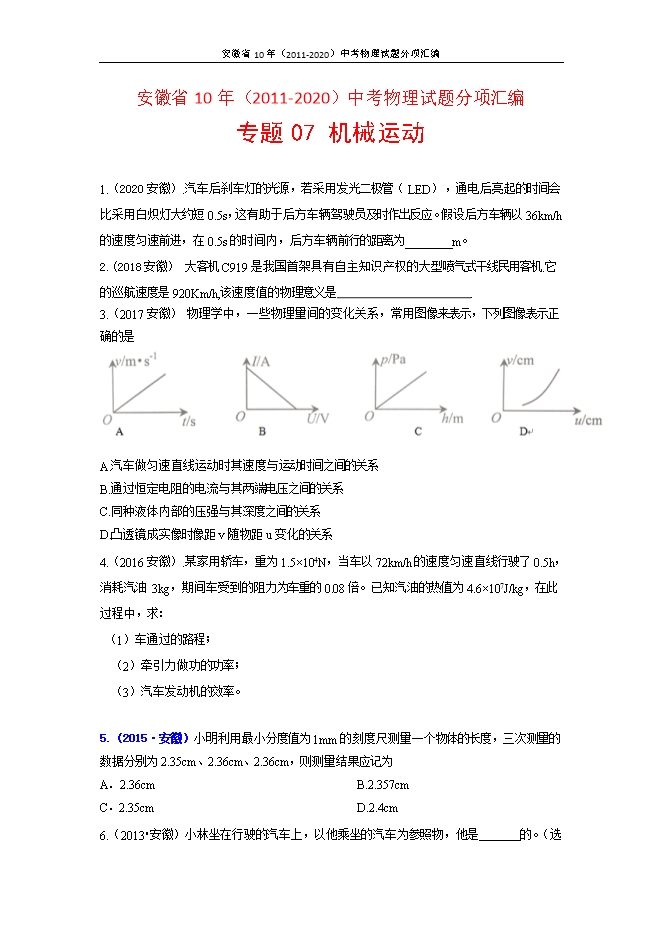 专题07 机械运动--安徽省10年(2011-2020)中考物理试题分项汇编(原卷版和解析版)
