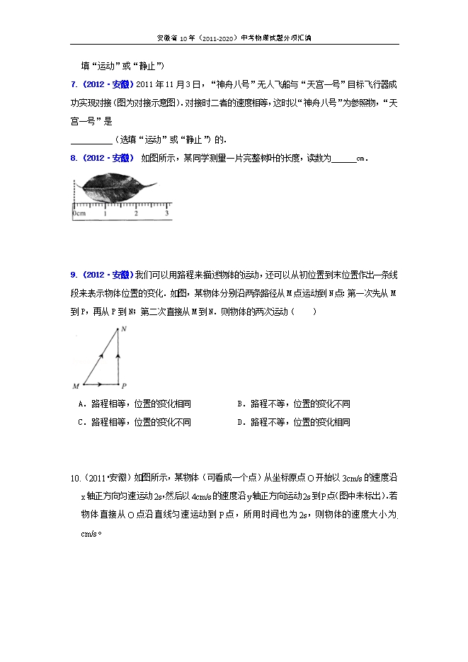 【内容简介】1.(2020安徽).汽车后刹车灯的光源,若采用发光二极管( LED) ,通电后亮起的时间会比采用白炽灯大约短0.5s,这有助于后方车辆驾驶员及时作出反应。假设后方车辆以36km/h的速度匀速前进,在0.5s的时间内,后方车辆前行的距离为________m。【答案】5【解析】【详解】后方车辆行驶的速度v=36km/h =10m/s行驶的时间t=0.5s,由 得在0.5s的时间内,后方车辆前行的距离为 2.(2018安徽) 大客机C919是我国首架具有自主知识产权的大型喷气式干线民用客机.它的巡航速度是920Km/h,该速度值的物理意义是_______________________.【答案】每小时飞行的距离为920km【解析】分析:速度是指物体在单位时间内通过的路程,表示物体运动快慢的物理量。 故答案为:大客机C919每小时通过的距离是920km。【点睛】此题主要考查的是学生对速度概念和物理意义的理解和掌握,基础性题目。3.(2017安徽) 物理学中,一些物理量间的变化关系,常用图像来表示,下列图像表示正确的是 A.汽车做匀速直线运动时其速度与运动时间之间的关系B.通过恒定电阻的电流与其两端电压之间的关系C.同种液体内部的压强与其深度之间的关系D.凸透镜成实像时像距v随物距u变化的关系【答案】C【解析】 考点:匀速直线运动 液体压强的特点 电流与电压的关系 凸透镜成像规律4.(2016安徽).某家用轿车,重为1.5×104N,当车以72km/h的速度匀速直线行驶了0.5h,消耗汽油 3kg,期间车受到的阻力为车重的0.08倍。已知汽油的热值为4.6×107J/kg,在此过程中,求: (1)车通过的路程; (2)牵引力做功的功率; (3)汽车发动机的效率。【答案】(1)36km(2)2.4×104W(3)31.3%【解析】试题分析:(1)由速度公式v=s/t可得s=vt=72km/h×0.5h=36 k m;(2)由于车受到的阻力为车重的0.08倍,可得阻力f=0.08G=0.08×1.5×104N=1.2×103N,又因为车匀速行驶,得牵引力大小等于阻力大小,即F=f=1.2×103N,做功功率P=W/t=FS/t=Fv=1.2×103N×20m/s=2.4×104W;(3)车牵引力做功W有=Pt=2.4×104W×0.5×3600s=4.32×107J;车消耗汽油能量W=Q=qm=4.6×107J/kg×3kg=1.38×108J;得汽车发动机的效率η= 考点:速度、功率、效率5.(2015•安徽)小明利用最小分度值为1mm的刻度尺测量一个物体的长度,三次测量的数据分别为2.35cm、2.36cm、2.36cm,则测量结果应记为A.2.36cmB.2.357cmC.2.35cmD.2.4cm【答案】A【解析】试题分析:在测量物理量时,有时为了减小测量误差,我们采取多次测量取平均值的方法,在取平均值时,必须保证记录结果符合测量工具的要求,如长度的测量,记录结果保留到刻度尺分度值的下一位,BD选项都不符合记录到分度值的下一位,当除不尽时或除数结果位数较多时采用四舍五入的方法,仍保留到分度值的下一位,故答案选A.【考点定位】多次测量取平均值6.(2013•安徽)小林坐在行驶的汽车上,以他乘坐的汽车为参照物,他是 的。(选填“运动”或“静止”)【解析】坐在行驶的汽车里的小林相对于汽车没有发生位置的变化,因此以汽车为参照物,他是静止的。故答案为:静止。7.(2012•安徽)2011年11月3日,“神舟八号”无人飞船与“天宫一号”目标飞行器成功实现对接(图为对接示意图).对接时二者的速度相等,这时以“神舟八号”为参照物,“天宫一号”是 (选填“运动”或“静止”)的. 8.(2012•安徽) 如图所示,某同学测量一片完整树叶的长度,读数为 cm. 分析:使用刻度尺测长度首先要弄清楚刻度尺的零刻度线量程和分度值再去读数,要估读到分度值的下一位.解答:解:图中刻度尺的分度值为1mm,起始端从零开始,要估读到分度值的下一位.因此A物体的长度为2.70cm;故答案为:2.70.9.(2012•安徽)我们可以用路程来描述物体的运动,还可以从初位置到末位置作出一条线段来表示物体位置的变化.如图,某物体分别沿两条路径从M点运动到N点:第一次先从M到P,再从P到N;第二次直接从M到N.则物体的两次运动( ) A.路程相等,位置的变化相同B.路程不等,位置的变化不同 C.路程相等,位置的变化不同D.路程不等,位置的变化相同分析:人、交通工具走过或驶过的距离叫路程;物体在某一段时间内,如果由初位置移到末位置,则由初位置到末位置的有向线段就是位置的变化.解答:解:由图可知,物体第一次通过的路程是MP+PN两段线段,第二次通过的路程是MN,从数学知识知,MN<MP+PN;但前后两次位置的变化都是线段MN.故答案选D.10.(2011•安徽)如图所示,某物体(可看成一个点)从坐标原点O开始以3cm/s的速度沿x轴正方向匀速运动2s,然后以4cm/s的速度沿y轴正方向运动2s到P点(图中未标出).若物体直接从O点沿直线匀速运动到P点,所用时间也为2s,则物体的速度大小为 cm/s。