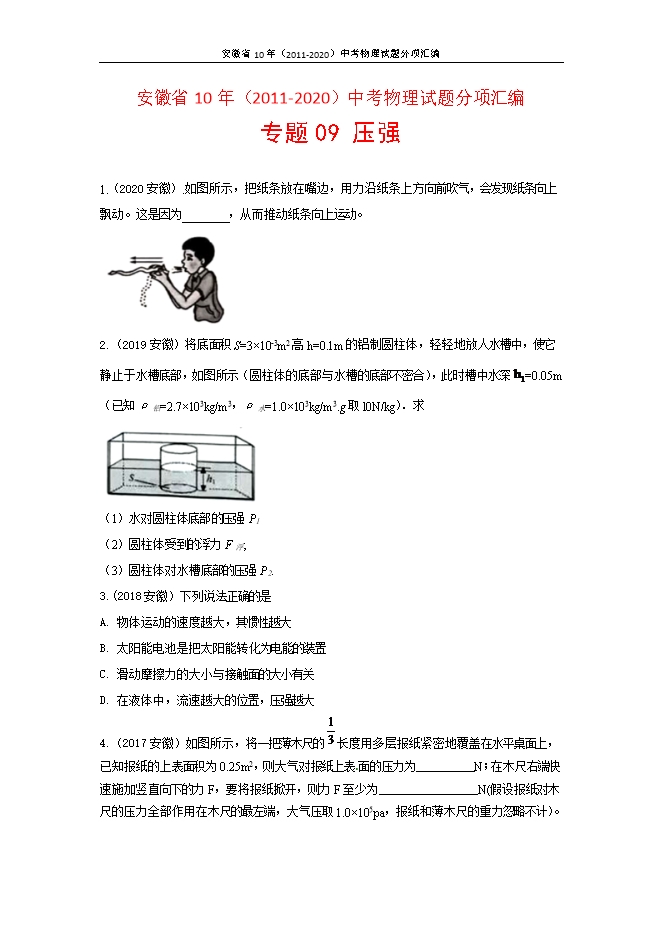 【内容简介】1.(2020安徽).如图所示,把纸条放在嘴边,用力沿纸条上方向前吹气,会发现纸条向上飘动。这是因为________,从而推动纸条向上运动。 【答案】纸条上方气体流速大,气体压强小【解析】由图可以看出,吹气时纸条上方空气流速大,压强变小,下方的空气流速不变,压强不变,纸条下方受到的向上的压强大于纸条上方向下的压强,故纸条在压强差的作用下飘起来。2.(2019安徽)将底面积S=3×10-3m2高h=0.1m的铝制圆柱体,轻轻地放人水槽中,使它静止于水槽底部,如图所示(圆柱体的底部与水槽的底部不密合),此时槽中水深 =0.05m(已知ρ铝=2.7×103kg/m3,ρ水=1.0×103kg/m3.g取l0N/kg).求 (1)水对圆柱体底部 压强P1(2)圆柱体受到的浮力F浮;(3)圆柱体对水槽底部的压强P2.【答案】(1)5×102Pa (2)1.5N (3)2.2×103Pa【解析】(1)水的深度h1=0.05m,则水对圆柱体底部的压强: =1.0×103kg/m3×10N/kg×0.05m=500Pa;(2)由图可知,圆柱体浸在水中的体积: =3×10-3m2×0.05m=1.5×10-4m3,根据阿基米德原理可得,圆柱体所受的浮力: =1.0×103kg/m3×1.5×10-4m3×10N/kg=1.5N;(3)圆柱体的重力: =2.7×103kg/m3×3×10-3m2×0.1m×10N/kg=8.1N;圆柱体静止于水槽底部,由力的平衡条件可知圆柱体对水槽底部的压力:F压=G铝-F浮=8.1N-1.5N=6.6N,则圆柱体对水槽底部的压强: .3.(2018安徽)下列说法正确的是A. 物体运动的速度越大,其惯性越大B. 太阳能电池是把太阳能转化为电能的装置C. 滑动摩擦力的大小与接触面的大小有关D. 在液体中,流速越大的位置,压强越大【答案】B【解析】分析:(1)惯性的大小只与物体的质量有关;(2)太阳能电池工作时,把光能转化成电能;(3)滑动摩擦力的大小与压力大小和接触面的粗糙程度有关;(4)在流体中,流速大的地方压强小,流速小的地方压强大。解答:A、惯性的大小只与物体的质量有关,与物体的运动速度无关,故A错误;B、太阳能电池可以将太阳能转化为电能,故B正确;C、滑动摩擦力的大小与压力大小和接触面的粗糙程度有关,与接触面的大小无关,故C错误;D、液体的压强与流速的关系:流速越大的位置压强越小,故D错误。故选:B。【点睛】本题考查了惯性、能量转化、影响滑动摩擦力大小的因素、流体流速与压强的关系等知识点,都属于基础知识。4.(2017安徽)如图所示,将一把薄木尺的 长度用多层报纸紧密地覆盖在水平桌面上,已知报纸的上表面积为0.25m2,则大气对报纸上表 面的压力为 N;在木尺右端快速施加竖直向下的力F,要将报纸掀开,则力F至少为 N(假设报纸对木尺的压力全部作用在木尺的最左端,大气压取1.0×105 pa,报纸和薄木尺的重力忽略不计)。 【答案】2.5×104 1.25×104【解析】[来源:Z,xx,k.Com] 考点:压力和压强 杠杆的平衡条件5.(2016安徽)理论上分析:浸在液体中的物体受到的浮力就是液体对物体表面压力的合力。如图所示,一个底面积为S,高为h的长方体浸没在密度为ρ的液体中。 (1)分析该物体侧面所受液体压力的合力F合1; (2)求出该物体底面所受液体压力的合力F合2; (3)结合以上结果,说明该埋论分析与阿基米德原埋的表述是一致的。【答案】( 1)F合1=0N(2)F合2=ρ液gSh(3)间接性过程 考点:压强 浮力6.(2015•安徽)如图所示,重为1. 5N的圆柱体竖直漂浮在水面上,其底 面积S=30cm2,则水对圆柱体下表面的压强P=Pa,圆柱体下表面所处的深度h=cm。(水的密度为1.0×103kg/m3) 【答案】500;5 【考点定位】液体压强;浮力产生的原因7.(2014•安徽)切割大理石、钢板的“水刀”可以对切割表面产生高达108Pa的压强,那么“水刀”作用在10 -2m2的面积上时,产生的压力为 N。【答案】106【解析】 8.(2013•安徽)在研究液面下深度为h处的液体压强时,可以设想这里有一个水平放置的“平面”,这个平面以上的液柱对平面的压力等于液柱所受的重力。如图所示,设“平面”的面积为S,液体的密度为ρ,用压强公式就能求出该处的压强。若减小所选“平面”的面积S,该处的液体压强将如何变化( ) A.增大B.减小C.不变D.无法判断【解析】解:根据液体压强的公式p=ρgh,液体内部的压强与液体的深度和密度有关,若所选“平面”的面积S变化,液体的密度与深度不变,压强不会改变。故选:C。9.(2012•安徽)地球的表面积约5.1×1014m2,地球表面的大气压约 1.0×105 Pa,则大气对地球表面的压力约为 N.分析:已知地球的表面积和大气压的值,根据F=pS求出大气对地球表面的压力.解答:解:大气对地球表面的压力:F=pS=1.0×105 Pa×5.1×1014m2=5.1×1019N.故答案为:5.1×1019.