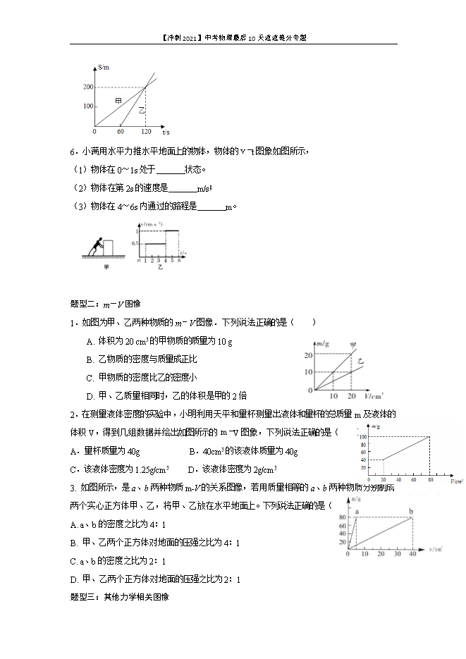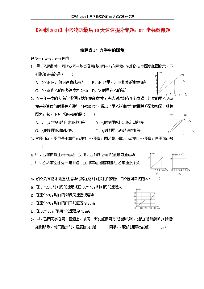 【内容简介】题型一:s-t、v-t图像1.甲、乙两物体,同时从同一地点沿直线向同一方向运动,它们的s﹣t图象如图所示。下列说法正确的是( )A.2~4s内乙做匀速直线运动 B.4s 时甲、乙两物体的速度相等C.0~4s内乙的平均速度为2m/s D.3s时甲在乙的前方【解析】解:由图象知,甲是一条过原点的直线,说明甲通过的路程与其时间成正比,即甲保持匀速直线运动;前2s,乙是一条过原点的直线,所以做匀速直线运动;2s后乙的位置没有变化,所以处于静止状态,即乙是先匀速直线运动后静止。A、2~4s 内,乙是静止状态。故A错误;B、4s 时甲是匀速直线运动状态,乙是静止状态,速度不同。故B错误;C、0~4s 乙运动的路程是 8m,时间是 4s,平均速度为v= = =2 m/s。故C正确;D、3s 时,乙运动的路程是 8m,甲运动的路程是 6m,乙在甲前方。故D错误。故选:C。2.在一年一度的大庆市“黎明湖端午龙舟赛”中,有人对某组在平行赛道上比赛的甲乙两队龙舟的速度与时间关系进行了仔细研究,得出了甲乙的速度与时间关系图象如图。根据图象可知,下列说法正确的是( )A.0﹣t1时刻两队所走距离相等 B.t1时刻甲队比乙队运动的快C.t1时刻甲队超过乙队 D.t1时刻甲乙两队速度相等【解答】解:AC.由图象可知,0~t1时刻内,甲队龙舟的平均速度小于乙队龙舟的平均速度,由v= 的变形式s=vt可知,甲队龙舟所走的距离小于乙队龙舟走过的距离,所以,t1时刻甲队不可能超过乙队,故AC错误;BD.由图象可知,t1时刻甲乙两队速度相等,两对运动的快慢相同,故B错误、D正确。故选:D。3.如图所示,图甲是小车甲运动的s-t图像,图乙是小车乙运动的v-t图像,由图像可知( )A. 甲、乙都由静止开始运动 B. 甲、乙都以2m/s的速度匀速运动C. 甲、乙两车经过5s一定相遇 D. 甲车速度越来越大, 乙车速度不变【答案】B【解析】A. 由图可知,甲车是由静止开始运动,乙车开始计时时的速度为2m/s,不是从静止开始运动,故A错误;B. 小车甲运动的s−t图象是一条过原点的直线,表示随着时间的推移,甲的路程逐渐的变大,所以甲做匀速直线运动,速度为v甲= =2m/s;小车乙运动的v−t图象是一条平行于横轴的直线,表示随着时间的推移,乙的速度不变,所以乙做匀速直线运动,速度为2m/s;所以,甲、乙都以2m/s匀速运动,故B正确;C. 甲、乙都以2m/s匀速运动,所以,如果两车反向运动,则5s可能相遇;如果两车同向运动,则两车不能相遇,故C错误;D. 甲、乙都以2m/s匀速运动,速度均不变,故D错误。故选B4.如图为某物体做直线运动时路程随时间变化的图像,由图像可知该物体( )A. 在0~20 s时间内的速度比在30~40 s时间内的速度大B. 在整个40 s时间内都做匀速直线运动C. 在整个40 s时间内的平均速度为2 m/sD. 在20~30 s内物体的速度为40 m/s【答案】C【解析】A、由图可知0~20 s时间内的速度为40m÷20s=2m/s,30~40 s时间内的速度为(80-40)÷10=4m/s,错误B、由图可知物体先匀速,然后禁止,最后匀速,错误C、由图可知整个40 s时间内的平均速度为80÷40=2m/s,正确D、在20~30 s内物体的速度为0 m/s,错误5.甲、乙两同学在同一直道上,从同一出发点相同方向跑步锻炼,运动的路程和时间图象如图所示,他们跑步时,速度较快的是 同学,相遇时距离出发点 m。 【解析】解:由图象知,甲在120s内运动200m,即相遇点距离出发点200m,而乙在120s﹣60s=60s内运动了200m,通过的路程相同,乙用的时间少,由v= 可知乙的速度较快。从图象可知,他们相遇时距离出发点距离200m故答案为:乙;200。6.小满用水平力推水平地面上的物体,物体的v﹣t图象如图所示,(1)物体在0~1s处于 状态。(2)物体在第2s的速度是 m/s;(3)物体在4~6s内通过的路程是 m。