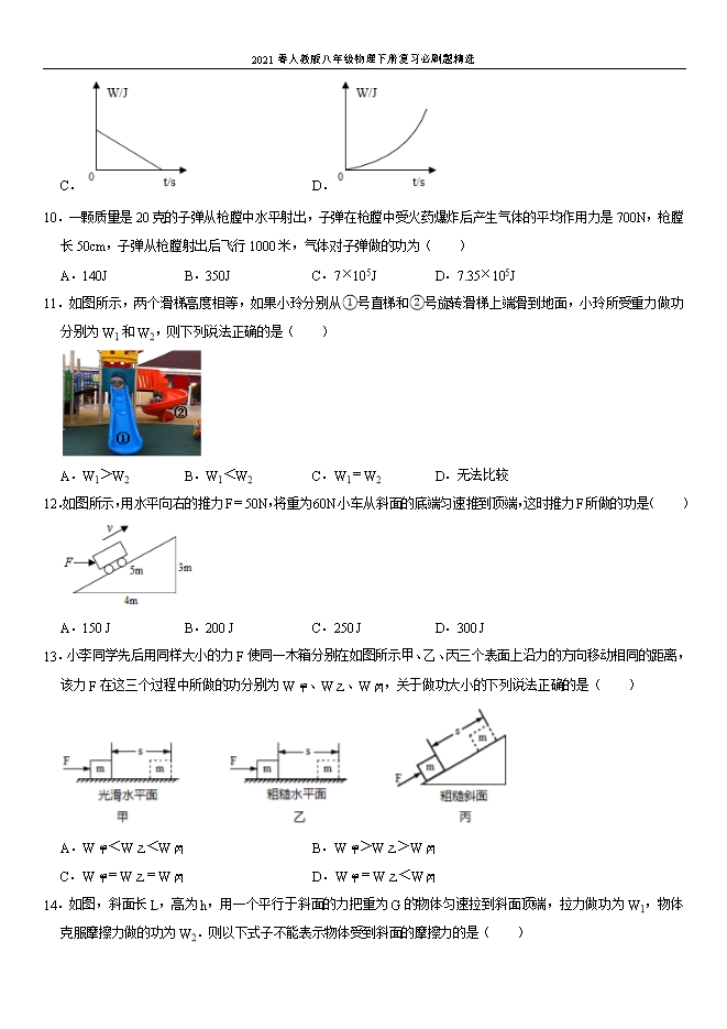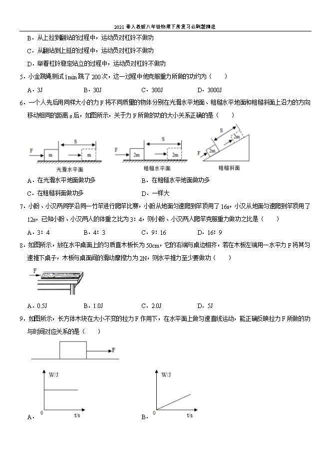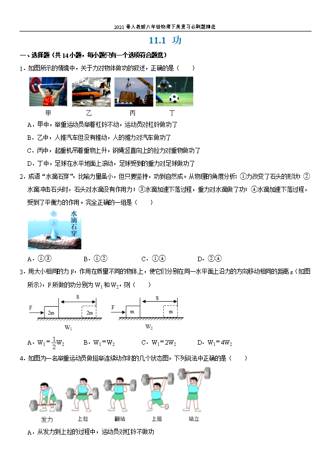 【内容简介】1.如图所示的情境中,关于力对物体做功的叙述,正确的是( ) A.甲中,举重运动员举着杠铃不动,运动员对杠铃做功了B.乙中,人推汽车但没有推动,人的推力对汽车做功了C.丙中,起重机吊着重物上升,钢绳竖直向上的拉力对重物做功了D.丁中,足球在水平地面上滚动,足球受到的重力对足球做功了解:A、运动员举着杠铃不动,有力但是没有在力的方向上移动距离,所以没有做功,故A错误。B、人推车,车没动,有力的作用,但是没有在力的方向上移动距离,所以没有做功,故B错误。C、起重机吊着重物上升,钢丝对重物有向上的拉力,同时重物在力的作用下沿力的方向移动了距离,所以做功了,故C正确。D、足球在水平地面上滚动,足球受重力的作用,但是并没有在重力的方向上移动距离,所以重力没有对足球做功,故D错误。故选:C。2.成语“水滴石穿”,比喻力量虽小,但只要坚持,功到自然成。从物理的角度分析:①力改变了石头的形状;②水滴冲击石头时,石头对水滴没有作用力;③水滴加速下落过程,重力对水滴做了功;④水滴加速下落过程,受到了平衡力的作用。完全正确的一组是( ) A.①③B.①②C.①④D.②④解:①“水滴石穿”,石头的形状发了改变,说明力改变了石头的形状,故①正确;②水滴冲击石头时,水滴对石头一个作用力,因物体间力的作用是相互的,石头对水滴有一个反作用力,故②错误;③水滴受重力作用加速下落,沿重力方向移动了距离,重力对水滴做了功,故③正确;④水滴在加速下落的过程中,受到的重力和空气的阻力,重力大于阻力,受到非平衡力的作用,故④错误;综上分析可知:①和③说法正确。故选:A。3.用大小相同的力F,作用在质量不同的物体上,使它们分别在同一水平面上沿力的方向移动相同的距离s(如图所示),F所做的功分别为W1和W2,则( ) A.W1= W2B.W1=W2C.W1=2W2D.W1=4W2解:两个物体受到的力都是F,通过的距离都是s,根据W=Fs可以判断两个力做功相等,即W1=W2。故选:B。4.如图为一名举重运动员做挺举连续动作时的几个状态图。下列说法中正确的是( )