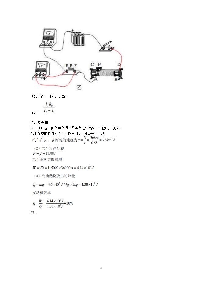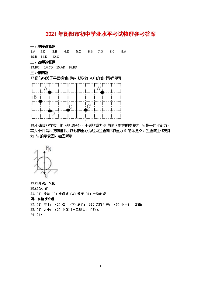 2021年湖南省衡阳市初中学业水平考试物理试题(pdf版,有答案)