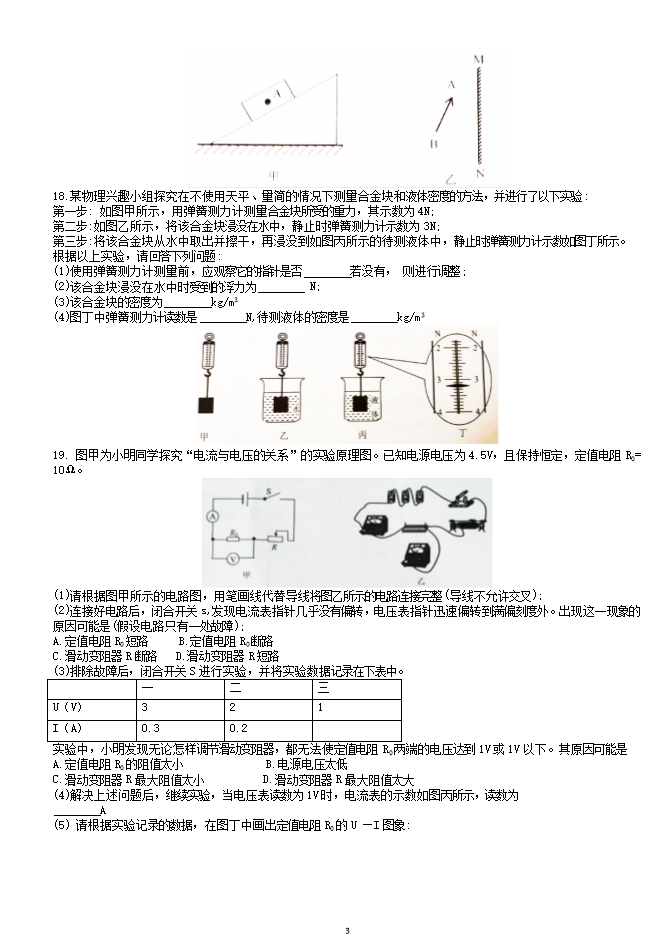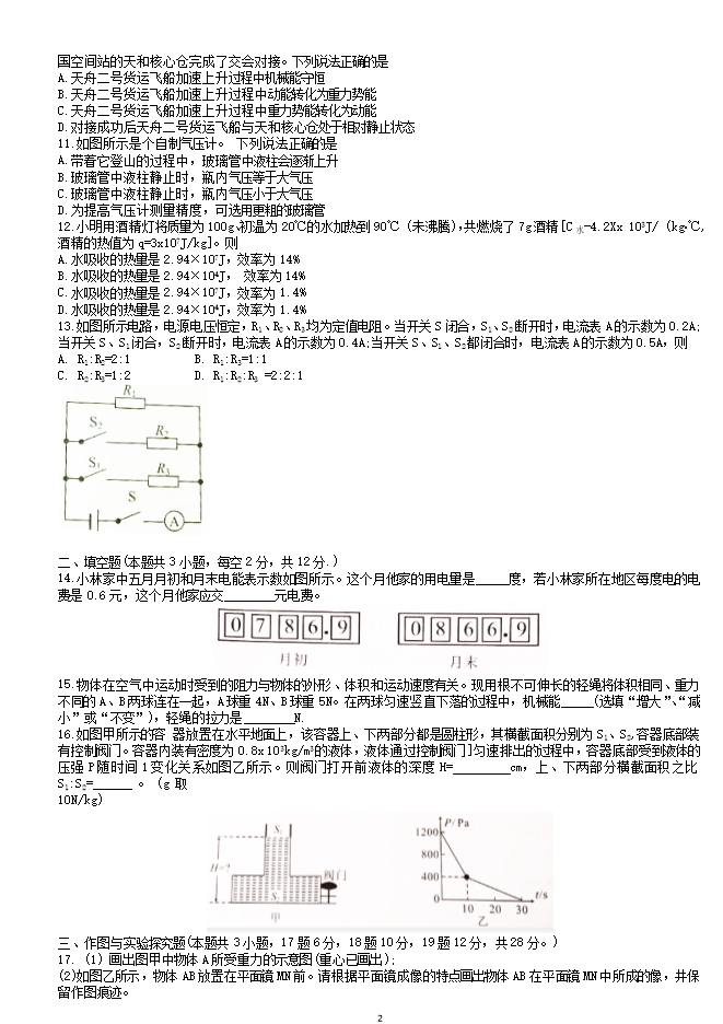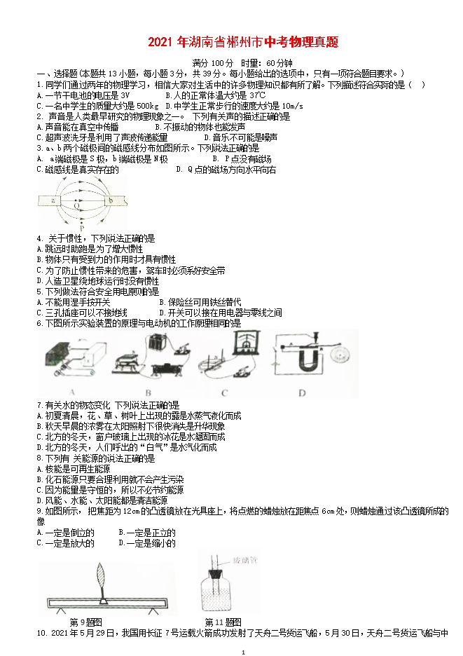 【内容简介】一、选择题(本题共13小题,每小题3分,共39分。每小题给出的选项中,只有一项符合题目要求。)1.同学们通过两年的物理学习,相信大家对生活中的许多物理知识都有所了解。下列描述符合实际的是( )A.一节干电池的电压是3V B.人的正常体温大约是37℃C.一名中学生的质量大约是500kg D.中学生正常步行的速度大约是10m/s2. 声音是人类最早研究的物理现象之一。 下列有关声的描述正确的是A.声音能在真空中传播 B.不振动的物体也能发声C.超声波洗牙是利用了声波传递能量 D.音乐不可能是噪声3.a、b两个磁极间的磁感线分布如图所示。下列说法正确的是A. a端磁极是S极,b端磁极是N极 B. P点没有磁场C.磁感线是真实存在的 D. Q点的磁场方向水平向右 4. 关于惯性,下列说法正确的是A.跳远时助跑是为了增大惯性B.物体只有受到力的作用时才具有惯性C.为了防止惯性带来的危害,驾车时必须系好安全带D.人造卫星绕地球运行时没有惯性5.下列做法符合安全用电原则的是A.不能用湿手按开关 B.保险丝可用铁丝替代C.三孔插座可以不接地线 D.开关可以接在用电器与零线之间6.下图所示实验装置的原理与电动机的工作原理相同的是 7.有关水的物态变化 下列说法正确的是A.初夏清晨,花、草、树叶上出现的露是水蒸气液化而成B.秋天早晨的浓雾在太阳照射下很快消失是升华现象C.北方的冬天,窗户玻璃上出现的冰花是水凝固而成D.北方的冬天,人们呼出的“白气”是水汽化而成8.下列有 关能源的说法正确的是A.核能是可再生能源B.化石能源只要合理利用就不会产生污染C.因为能量是守恒的,所以不必节约能源D.风能、水能、太阳能都是清洁能源9.如图所示, 把焦距为12cm的凸透镜放在光具座上,将点燃的蜡烛放在距焦点6cm处,则蜡烛通过该凸透镜所成的像A.一定是倒立的 B.一定是正立的C.一定是放大的 D.一定是缩小的 第9题图 第11题图10. 2021年5月29日,我国用长征7号运载火箭成功发射了天舟二号货运飞船,5月30日,天舟二号货运飞船与中国空间站的天和核心仓完成了交会对接。下列说法正确的是A.天舟二号货运飞船加速上升过程中机械能守恒B.天舟二号货运飞船加速上升过程中动能转化为重力势能C.天舟二号货运飞船加速上升过程中重力势能转化为动能D.对接成功后天舟二号货运飞船与天和核心仓处于相对静止状态11.如图所示是个自制气压计。 下列说法正确的是A.带着它登山的过程中,玻璃管中液柱会逐渐上升B.玻璃管中液柱静止时,瓶内气压等于大气压C.玻璃管中液柱静止时,瓶内气压小于大气压D.为提高气压计测量精度,可选用更粗的玻璃管12.小明用酒精灯将质量为100g、初温为20℃的水加热到90℃ (未沸腾),共燃烧了7g酒精[C水-4.2Xx 103J/ (kg▪℃,酒精的热值为q=3x107J/kg]。则A.水吸收的热量是2.94×107J,效率为14%B.水吸收的热量是2.94×104J, 效率为14%C.水吸收的热量是2.94×107J,效率为1.4%D.水吸收的热量是2.94×104J,效率为1.4% 13.如图所示电路,电源电压恒定,R1、R2、R3均为定值电阻。当开关S闭合,S1、S2断开时,电流表A的示数为0.2A;当开关S、S1闭合,S2断开时,电流表A的示数为0.4A;当开关S、S1、S2都闭合时,电流表A的示数为0.5A,则A. R1:R2=2:1 B. R1:R3=1:1C. R2:R3=1:2 D. R1:R2:R3 =2:2:1 二、填空题(本题共3小题,每空2分,共12分.)14.小林家中五月月初和月末电能表示数如图所示。这个月他家的用电量是 度,若小林家所在地区每度电的电费是0.6元,这个月他家应交 元电费。
