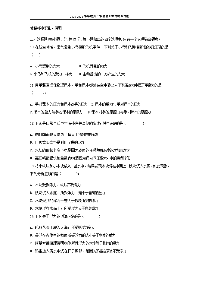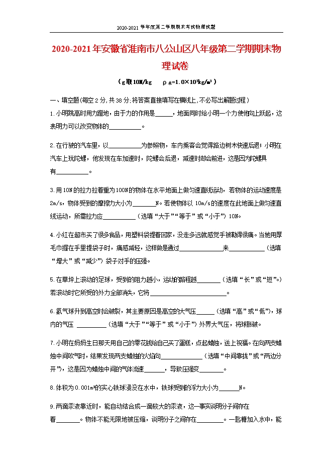 2020-2021年安徽省淮南市八公山区物理八年级第二学期期末试卷(word版,含答案)