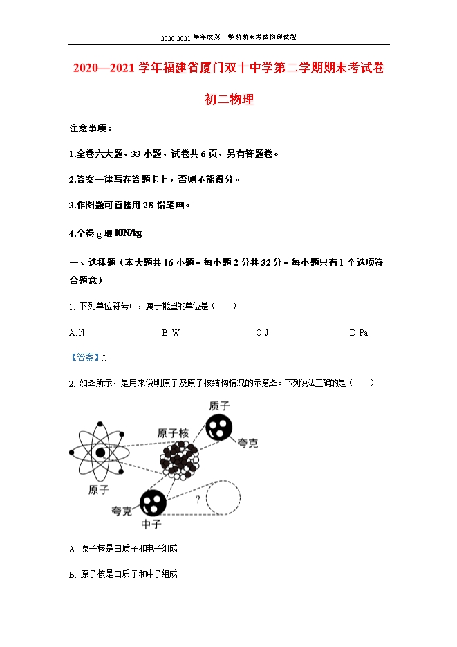 2020-2021年福建省厦门双十中学物理八年级第二学期期末试卷(word版,含答案)