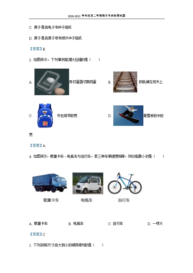 【内容简介】一、选择题(本大题共16小题。每小题2分共32分。每小题只有1个选项符合题意)1. 下列单位符号中,属于能量的单位是( )A. NB. WC. JD. Pa【答案】C2. 如图所示,是用来说明原子及原子核结构情况的示意图。下列说法正确的是( ) A. 原子核是由质子和电子组成B. 原子核是由质子和中子组成C. 原子是由电子和中子组成D. 原子是由原子核和核外中子组成【答案】B3. 如图所示,下列事例能增大压强的是( )A. 用切蛋器切熟鸡蛋B. 钢轨铺在枕木上C. 书包背带较宽D. 滑雪板较长较宽【答案】A4. 如图所示,载重卡车、电瓶车与自行车,若三种车辆速度相等,则动能最小 是( ) A. 载重卡车B. 电瓶车C. 自行车D. 一样大【答案】C5. 下列按照尺寸由大到小的顺序排列的是( )A. 银河系、地球、原子、分子B. 太阳系、银河系、生物体、分子C. 太阳系、地球、电子、分子D. 银河系、地球、分子、原子核【答案】D6. 如图所示的生活用具中,使用时属于省力杠杆的是( )......