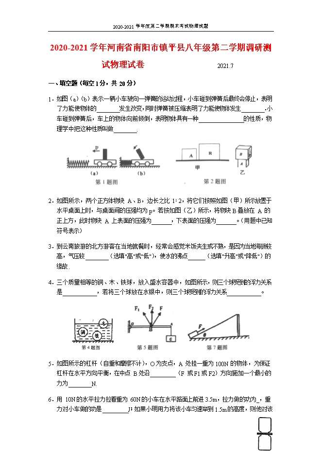 2020-2021年河南省南阳市镇平县物理八年级第二学期期末试卷(word版,含答案)