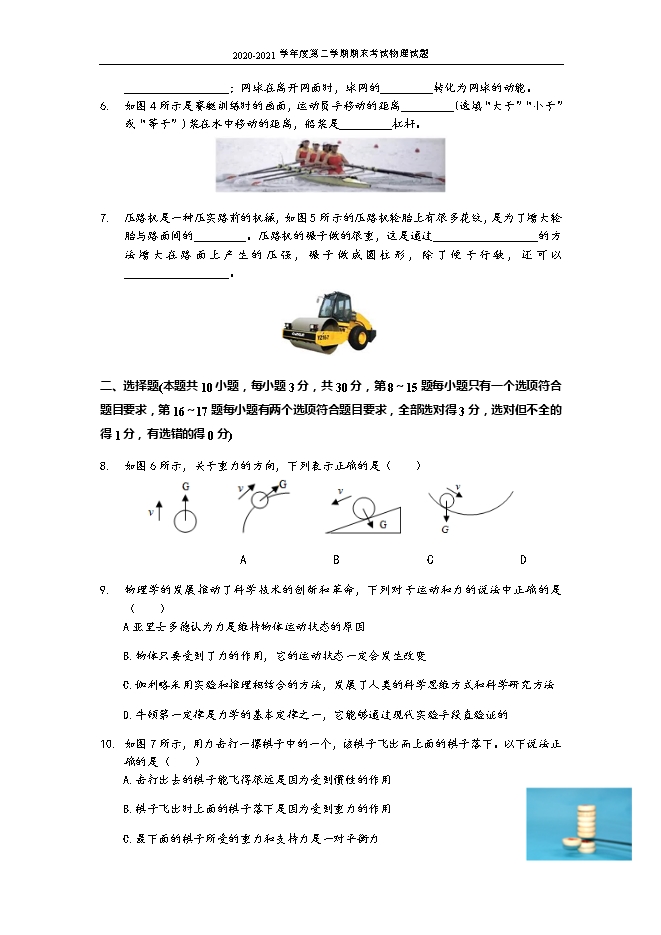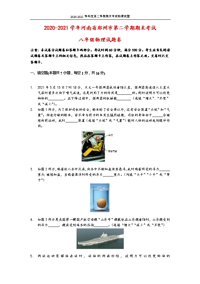 【内容简介】一、填空题(本题共7小题,每空1分,共16分)1.2021年5月15日7时18分,天文一号探测器成功着陆火星,探测器高速进入火星大气层时曾多次向下喷气减速,这是利用了力的作用是________的。同时说明力可以改变物体的_________。在下降过程中,探测器的机械能________(选填“增大”、“不变”或“减小”)。2.如图1所示,为了保护司机的安全,轿车除了安全带以外,还有安全装置“头枕”和“气囊”。快速行驶的轿车,若不幸与前方的车发生猛烈碰撞,司机的身体由于______会继续向前运动,此时_______装置(选填“头枕”或“气囊”)能对人体的运动起到缓冲作用。 3.如图2所示,鸡蛋放入水中沉底,向水中不断加盐使其悬浮,此时鸡蛋所受的浮力______重力;继续加盐,当鸡蛋漂浮时所受的浮力______重力。(均填“大于”“小于”或“等于”) 4.如图3所示是我国第一艘国产航空母舰“山东号”舰载机在山东舰着陆时,山东舰受到的浮力______,舰底受到海水的压强________。(选填“增大”“减小”或“不变”) 5.网球运动员挥拍击球时,球拍的网面凹陷,说明力可以改变物体的__________________;网球在离开网面时,球网的_________转化为网球的动能。6.如图4所示是赛艇训练时的画面,运动员手移动的距离_________(选填“大于”“小于”或“等于”)桨在水中移动的距离,船桨是_________杠杆。 7.压路机是一种压实路前的机械,如图5所示的压路机轮胎上有很多花纹,是为了增大轮胎与路面间的_________。压路机的碾子做的很重,这是通过__________________的方法增大在路面上产生的压强,碾子做成圆柱形,除了便于行驶,还可以__________________。 二、选择题(本题共10小题,每小题3分,共30分,第8~15题每小题只有一个选项符合题目要求,第16~17题每小题有两个选项符合题目要求,全部选对得3分,选对但不全的得1分,有选错的得0分)......