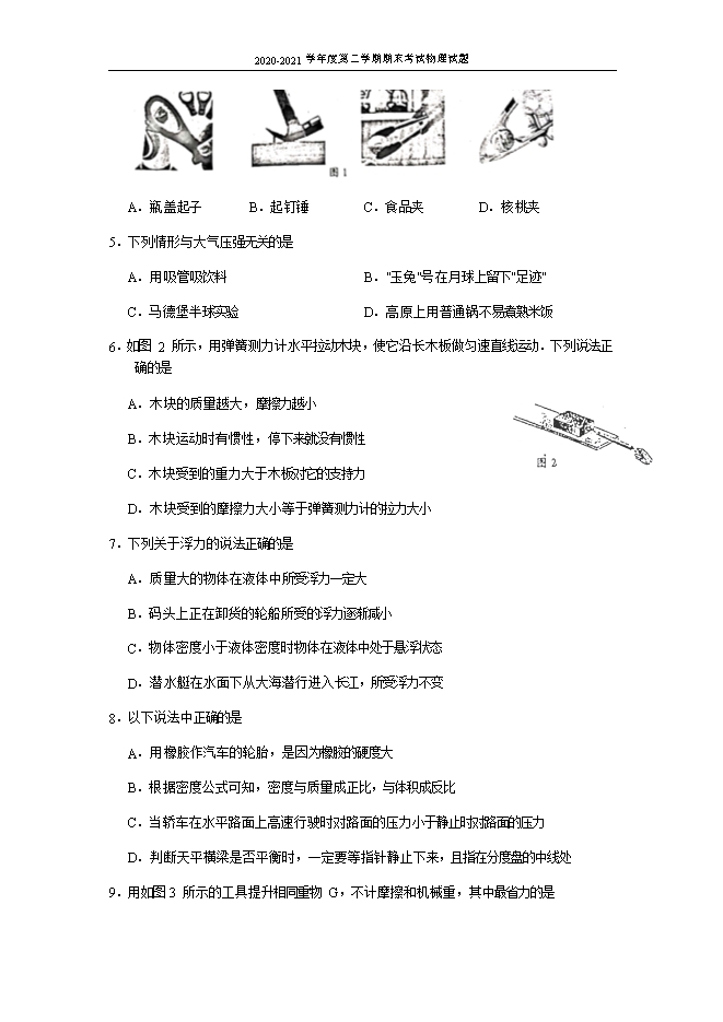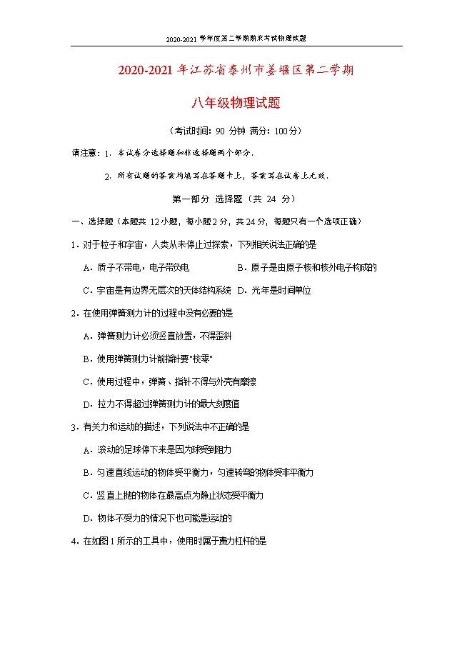 【内容简介】一、选择题(本题共 12小题,每小题2分,共24分,每题只有一个选项正确) 1.对于粒子和宇宙,人类从未停止过探索,下列相关说法正确的是A.质子不带电,电子带负电 B.原子是由原子核和核外电子构成的 C.宇宙是有边界无层次的天体结构系统 D.光年是时间单位2.在使用弹簧测力计的过程中没有必要的是A.弹簧测力计必须竖直放置,不得歪斜 B.使用弹簧测力计前指针要"校零" C.使用过程中,弹簧、指针不得与外壳有摩擦 D.拉力不得超过弹簧测力计的最大刻度值 3.有关力和运动的描述,下列说法中不正确的是A.滚动的足球停下来是因为球受到阻力B.匀速直线运动的物体受平衡力,匀速转弯的物体受非平衡力C.竖直上抛的物体在最高点为静止状态受平衡力 D.物体不受力的情况下也可能是运动的4.在如图1所示的工具中,使用时属于费力杠杆的是......