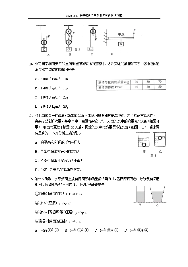 2020-2021年江苏省泰州市姜堰区物理八年级第二学期期末试卷(word版,含答案)