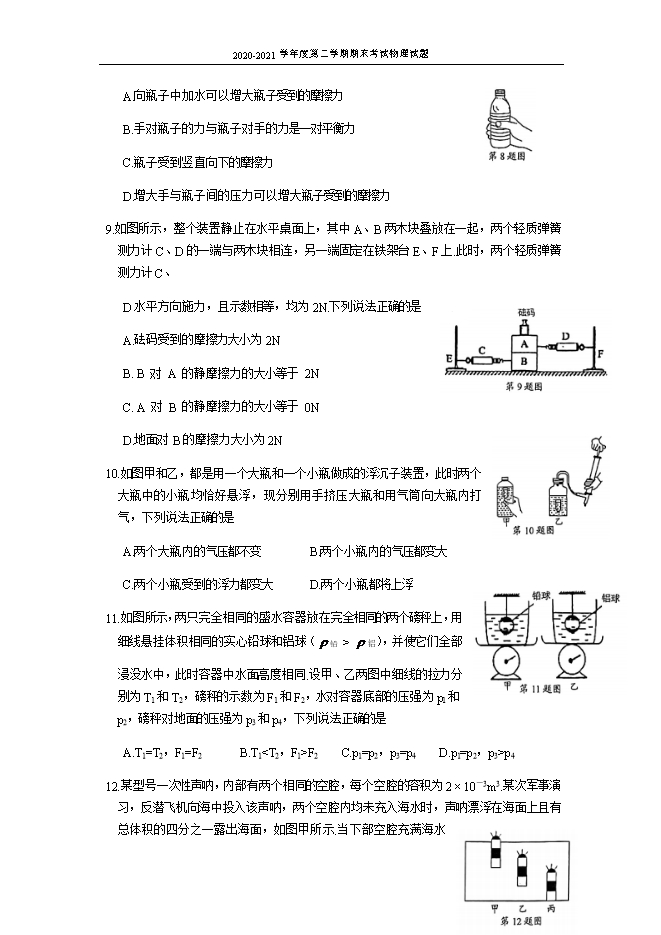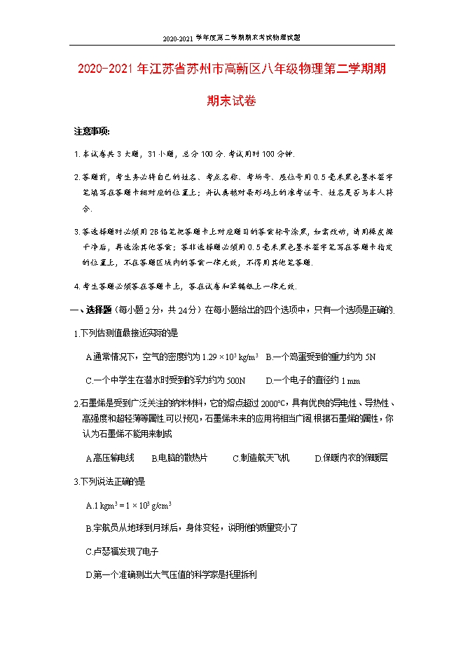 2020-2021年江苏省苏州市高新区物理八年级第二学期期末试卷(word版,无答案)