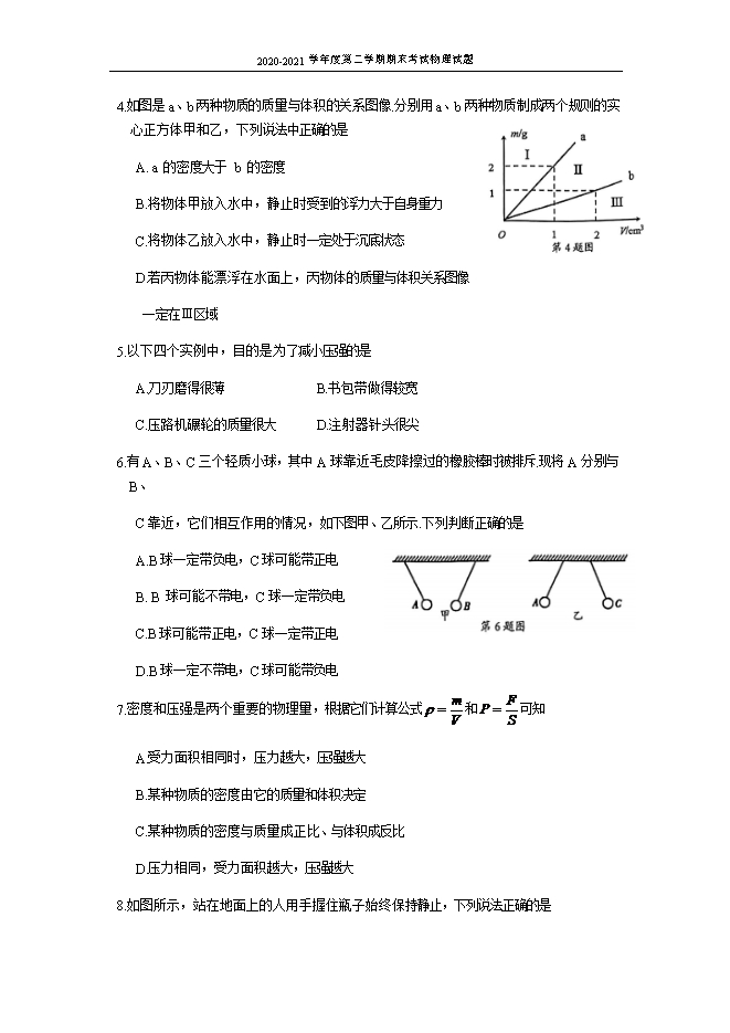 【内容简介】一、选择题(每小题2分,共24分)在每小题给出的四个选项中,只有一个选项是正确的.1.下列估测值最接近实际的是A.通常情况下,空气的密度约为1.29 × 103 kg/m3B.一个鸡蛋受到的重力约为5NC.一个中学生在潜水时受到的浮力约为500ND.一个电子的直径约1 mm2.石墨烯是受到广泛关注的纳米材料,它的熔点超过2000℃,具有优良的导电性、导热性、高强度和超轻薄等属性.可以预见,石墨烯未来的应用将相当广阔.根据石墨烯的属性,你认为石墨烯不能用来制成A.高压输电线B.电脑的散热片C.制造航天飞机D.保暖内衣的保暖层3.下列说法正确的是A.1 kgm3 = 1 × 103 g/cm3B.宇航员从地球到月球后,身体变轻,说明他的质量变小了C.卢瑟福发现了电子D.第一个准确测出大气压值的科学家是托里拆利4.如图是a、b两种物质的质量与体积的关系图像.分别用a、b两种物质制成两个规则的实心正方体甲和乙,下列说法中正确的是 A. a 的密度大于 b 的密度B.将物体甲放入水中,静止时受到的浮力大于自身重力C.将物体乙放入水中,静止时一定处于沉底状态D.若丙物体能漂浮在水面上,丙物体的质量与体积关系图像 一定在Ⅲ区域5.以下四个实例中,目的是为了减小压强的是A.刀刃磨得很薄 B.书包带做得较宽C.压路机碾轮的质量很大D.注射器针头很尖6.有A、B、C三个轻质小球,其中A球靠近毛皮降擦过的橡胶棒时被排斥.现将A分别与......