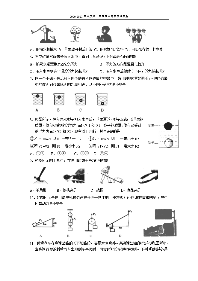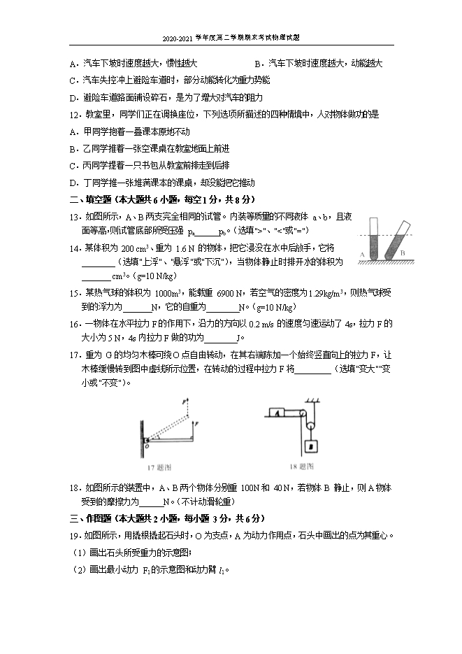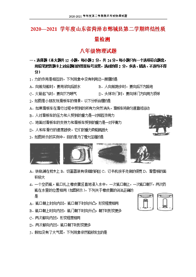 【内容简介】一、选择题(本大题共12 小题,每小题2 分,共 24分。每小题只有一个选项符合题意,用铅笔把答题卡上对应题目的答案标号涂黑,选对的得2 分,多选、错选、不选均不得分)1.力的作用是相互的,下列现象中没有利用这一原理的是A.向前划船时,要用浆向后拨水B.人向前跑步时,要向后下方路地 C.火箭起飞时,要向下方喷气D.头球攻门时,要向球门方向用力顶球 2.如图是小朋友玩滑板车的情景,以下分析合理的是A.如果滑板车在滑行过程中受到的所有力突然消失,滑板车将做匀速直线运动 B.人对滑板车的压力和人受到的重力是一对相互作用力 C.地面对滑板车的支持力和滑板车受到的重力是一对平衡力 D.人和车滑行的速度越快,它们的重力势能就越大 3.如图所示的实例中,目的是为了增大压强的是 A.铁轨铺在枕木上B.切蛋器装有很细的钢丝C.订书机按手处做的很宽D.滑雪板的面积较大 4.一个空药瓶。瓶口扎上橡皮膜竖直地浸入水中,一次瓶口朝上,一次瓶口朝下,两次药瓶在水里的位置相同(如图所示),下列关于橡皮膜的说法正确的是A.瓶口朝上时向内凹,瓶口朝下时向外凸,形变程度相同 B.瓶口朝上时向内凹,瓶门朝下时向外凸,朝下时形变更多 C.两次都向内凹,形变程度相同 D.两次都向内凹,瓶口朝下时形变更多5.假如没有了大气层,下列现象依然能够发生的是......