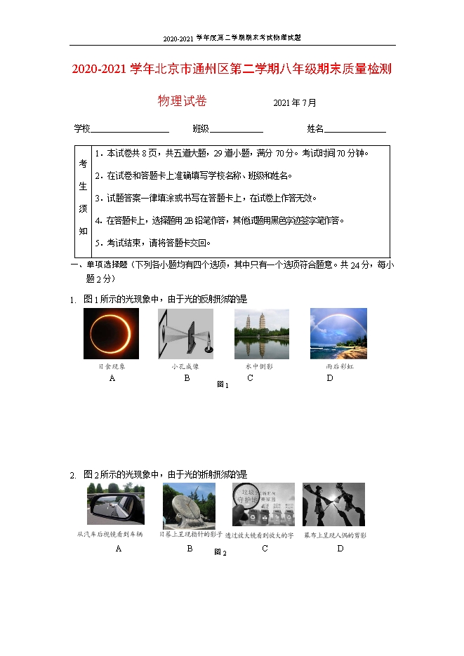 2020-2021年北京市通州区物理八年级第二学期期末试卷(word版,含答案)