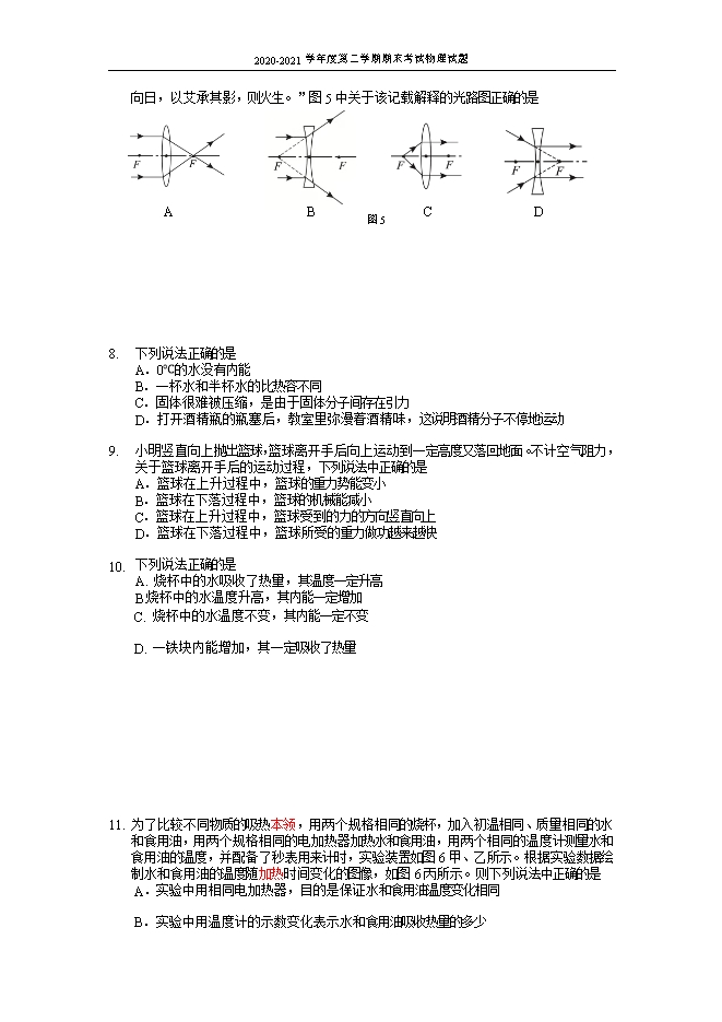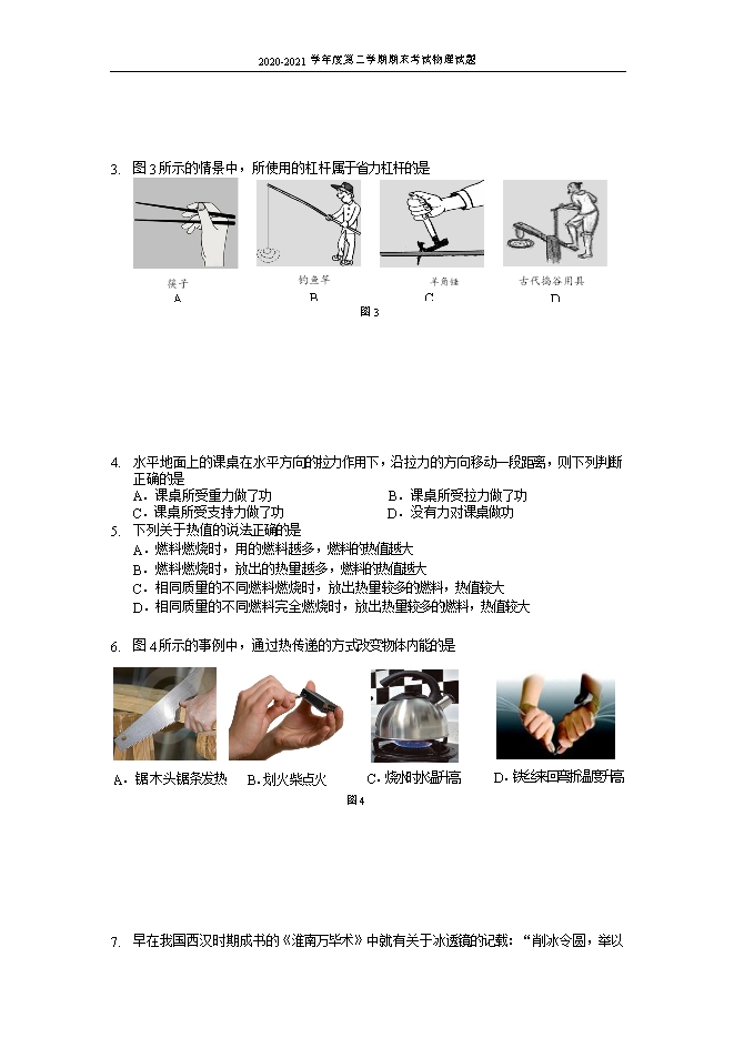 【内容简介】一、单项选择题(下列各小题均有四个选项,其中只有一个选项符合题意。共24分,每小题2分)1.图1所示的光现象中,由于光的反射形成的是2.图2所示的光现象中,由于光的折射形成的是3.图3所示的情景中,所使用的杠杆属于省力杠杆的是4.水平地面上的课桌在水平方向的拉力作用下,沿拉力的方向移动一段距离,则下列判断正确的是A.课桌所受重力做了功 B.课桌所受拉力做了功C.课桌所受支持力做了功 D.没有力对课桌做功5.下列关于热值的说法正确的是A.燃料燃烧时,用的燃料越多,燃料的热值越大B.燃料燃烧时,放出的热量越多,燃料的热值越大C.相同质量的不同燃料燃烧时,放出热量较多的燃料,热值较大D.相同质量的不同燃料完全燃烧时,放出热量较多的燃料,热值较大6.图4所示的事例中,通过热传递的方式改变物体内能的是7.早在我国西汉时期成书的《淮南万毕术》中就有关于冰透镜的记载:“削冰令圆,举以向日,以艾承其影,则火生。”图5中关于该记载解释的光路图正确的是8.下列说法正确的是A.0℃的水没有内能B.一杯水和半杯水的比热容不同C.固体很难被压缩,是由于固体分子间存在引力D.打开酒精瓶的瓶塞后,教室里弥漫着酒精味,这说明酒精分子不停地运动9.小明竖直向上抛出篮球,篮球离开手后向上运动到一定高度又落回地面。不计空气阻力,关于篮球离开手后的运动过程,下列说法中正确的是A.篮球在上升过程中,篮球的重力势能变小B.篮球在下落过程中,篮球的机械能减小C.篮球在上升过程中,篮球受到的力的方向竖直向上D.篮球在下落过程中,篮球所受的重力做功越来越快10.下列说法正确的是A. 烧杯中的水吸收了热量,其温度一定升高B.烧杯中的水温度升高,其内能一定增加C. 烧杯中的水温度不变,其内能一定不变D. 一铁块内能增加,其一定吸收了热量