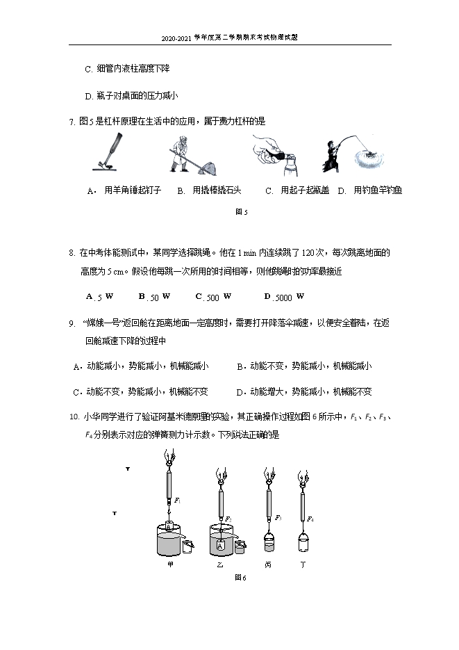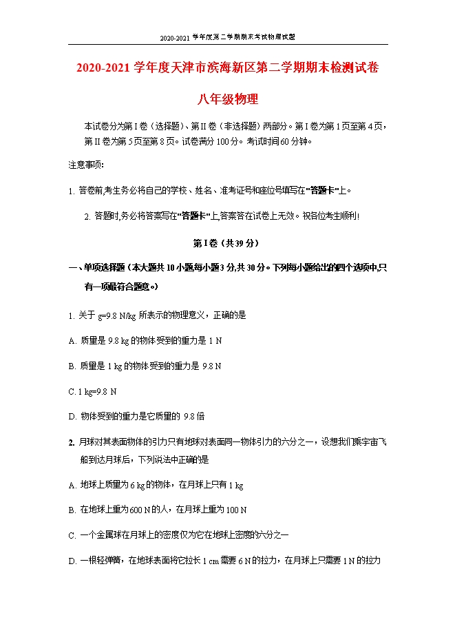 2020-2021年天津市滨海新区物理八年级第二学期期末试卷(word版,含答案)