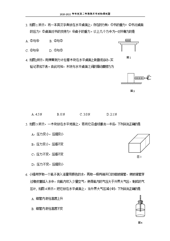 【内容简介】1. 关于g=9.8 N/kg所表示的物理意义,正确的是A. 质量是9.8 kg的物体受到的重力是1 NB. 质量是1 kg的物体受到的重力是9.8 NC. 1 kg=9.8 ND. 物体受到的重力是它质量的9.8倍2. 月球对其表面物体的引力只有地球对表面同一物体引力的六分之一,设想我们乘宇宙飞船到达月球后,下列说法中正确的是A. 地球上质量为6 kg的物体,在月球上只有1 kgB. 在地球上重为600 N的人,在月球上重为100 NC. 一个金属球在月球上的密度仅为它在地球上密度的六分之一D. 一根轻弹簧,在地球表面将它拉长1 cm需要6 N的拉力,在月球上只需要1 N的拉力3. 如图1所示,将一本英汉字典放在水平桌面上,存在的力有:①书的重力;②书对A. ③与④ B. ②与③C. ②与④ D. ①与③4. 如图2所示,用弹簧测力计拉着木块在水平桌面上做直线运动,实验记录如下表。由此可知,木块与水平桌面之间的滑动摩擦力为实验次数123木块运动情况越来越快匀速运动越来越慢弹簧测力计读数(牛)4.53.02.1A. 4.5 N B. 0 N C. 3.0 N D. 2.1 N5. 如图3所示,一木块放在水平地面上,若将它沿虚线截去一半后,下列说法正确的是 A.压力变小,压强变小 B.压力变小,压强不变C.压力不变,压强不变 D.压力不变,压强变小6. 小强同学取一个瓶子装入适量带颜色的水,再取一根两端开口的细玻璃管,使玻璃管穿过橡皮塞插入水中,向瓶内吹入少量空气,使得瓶内的气压大于外界大气压,制成的气压计, 如图4所示。把它放在水平桌面上,当外界大气压减小时,下列说法正确的是A. 细管内液柱高度上升B. 细管内液柱高度不变C. 细管内液柱高度下降......