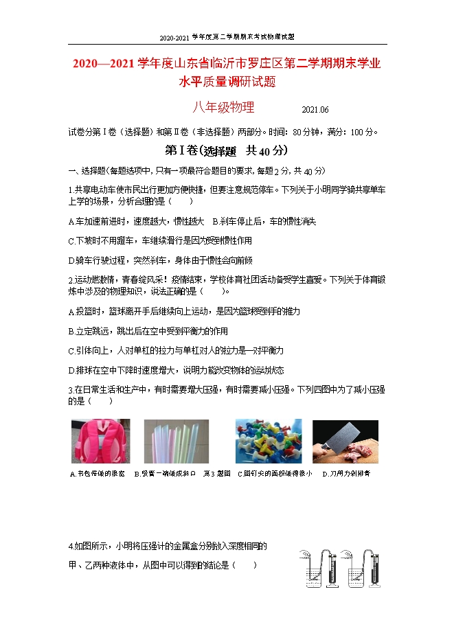2020-2021年山东省临沂市罗庄区物理八年级第二学期期末试卷(word版,含答案)