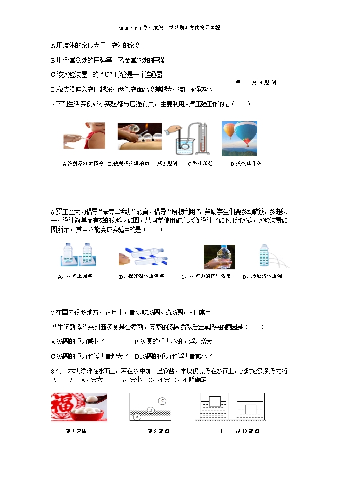 【内容简介】一、选择题(每题选项中,只有一项最符合题目的要求,每题2分,共40分)1.共享电动车使市民出行更加方便快捷,但要注意规范停车。下列关于小明同学骑共享单车上学的场景,分析合理的是( )A.车加速前进时,速度越大,惯性越大B.刹车停止后,车的惯性消失C.下坡时不用蹬车,车继续滑行是因为受到惯性作用D.骑车行驶过程,突然刹车,身体由于惯性会向前倾2.运动燃激情,青春绽风采!疫情结束,学校体育社团活动备受学生喜爱。下列关于体育锻炼中涉及的物理知识,说法正确的是( )。A.投篮时,篮球离开手后继续向上运动,是因为篮球受到手的推力B.立定跳远,跳出后在空中受到平衡力的作用 C.引体向上,人对单杠的拉力与单杠对人的拉力是一对平衡力D.排球在空中下降时速度增大,说明力能改变物体的运动状态3.在日常生活和生产中,有时需要增大压强,有时需要减小压强。下列四图中为了减小压强的是( )4.如图所示,小明将压强计的金属盒分别放入深度相同的甲、乙两种液体中,从图中可以得到的结论是( )A.甲液体的密度大于乙液体的密度B.甲金属盒处的压强等于乙金属盒处的压强C.该实验装置中的“U”形管是一个连通器D.橡皮膜伸入液体越深,两管液面高度差越大,液体压强越小5.下列生活实例或小实验都与压强有关,主要利用大气压强工作的是( ) ......