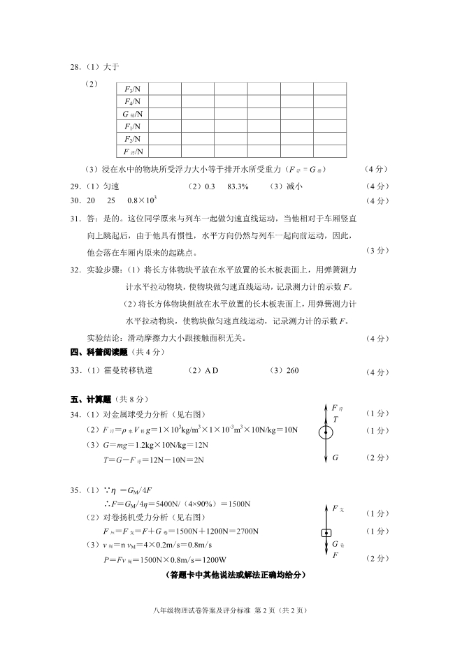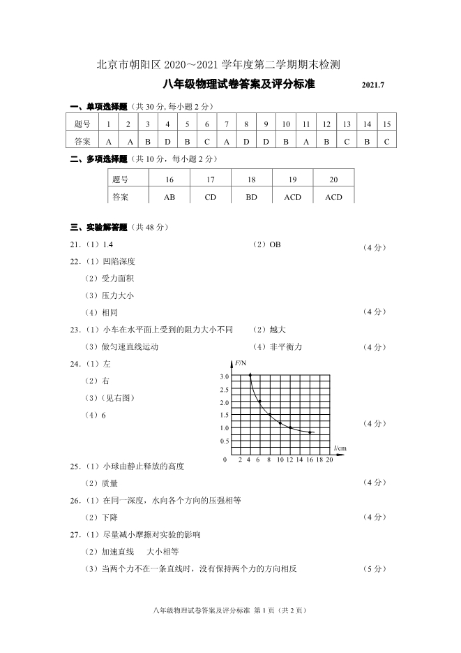 2020-2021年北京市朝阳区物理八年级第二学期期末试卷 (PDF版,含答案)