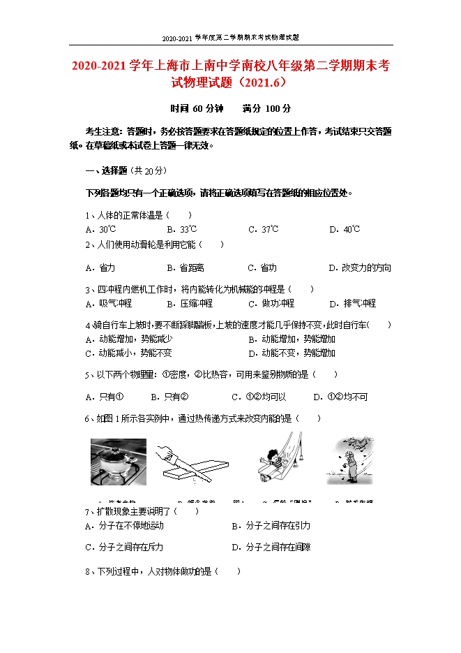 2020-2021年上海市上南中学南校物理八年级第二学期期末试卷(word版,含答案)