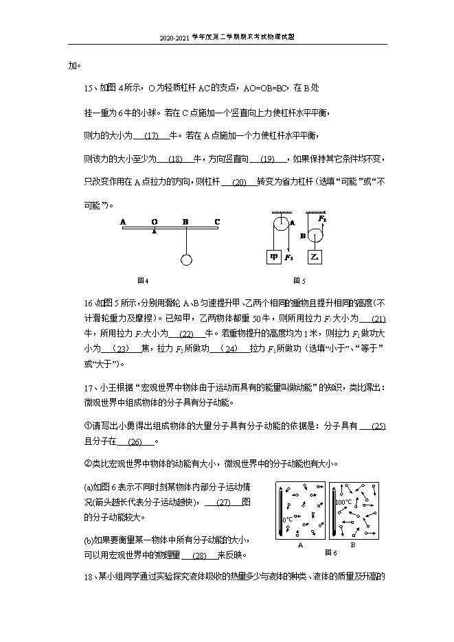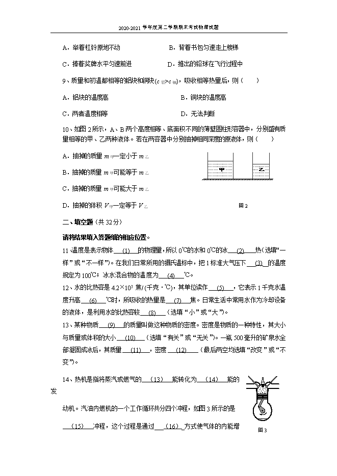 【内容简介】一、选择题(共20分)下列各题均只有一个正确选项,请将正确选项填写在答题纸的相应位置处。1、人体的正常体温是( ) A.30℃B.33℃C.37℃D.40℃2、人们使用动滑轮是利用它能( )A.省力B.省距离C.省功D.改变力的方向3、四冲程内燃机工作时,将内能转化为机械能的冲程是( )A.吸气冲程B.压缩冲程C.做功冲程D.排气冲程4、骑自行车上坡时,要不断踩脚踏板,上坡的速度才能几乎保持不变,此时自行车( )A.动能增加,势能减少B.动能增加,势能增加 C.动能减小,势能不变D.动能不变,势能增加5、以下两个物理量:①密度,②比热容,可用来鉴别物质的是( )A.只有①B.只有②C.①②均可以D.①②均不可6、如图1所示各实例中,通过热传递方式来改变内能的是( )7、扩散现象主要说明了( )A.分子在不停地运动B.分子之间存在引力C.分子之间存在斥力D.分子之间存在间隙8、下列过程中,人对物体做功的是( )A.举着杠铃原地不动 B.背着书包匀速走上楼梯C.捧着奖牌水平匀速前进 D.推出的铅球在飞行过程中9、质量和初温都相等的铝块和铜块(c铝>c铜),吸收相等热量后,则( )A.铝块的温度高B.铜块的温度高C.两者温度相等D.无法判断10、如图2所示,A、B两个高度相等、底面积不同的薄壁圆柱形容器中,分别盛有质量相等的甲、乙两种液体。若在两容器中分别抽掉相同深度的原液体,则( )A.抽掉的质量m甲一定小于m乙B.抽掉的质量m甲可能等于m乙C.抽掉的质量m甲可能大于m乙D.抽掉的体积V甲一定等于V乙 图2 二、填空题(共32分)请将结果填入答题纸的相应位置。11、温度是表示物体 (1) 的物理量,所以0℃的水和0℃的冰___(2)____热(选填“一样”或“不一样”)。在我们日常所用的摄氏温标中,把1标准大气压下___(3)__的温度规定为100℃;冰水混合物的温度为 (4) ℃。12、水的比热容是4.2×103 焦/ (千克•℃),其单位读作 (5) ,它表示1千克水温度升高 (6) ℃时,所吸收的热量是 (7) 焦。日常生活中常用水作为冷却设备......