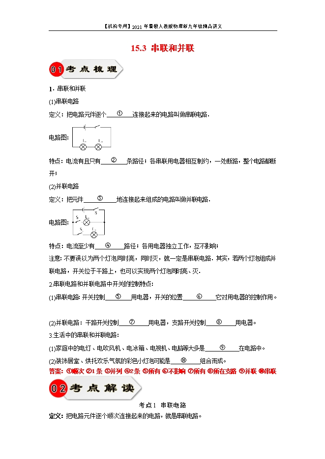 15.3 串联和并联--【机构专用】2021年暑假人教版物理新九年级精品讲义(教师版和学生版)