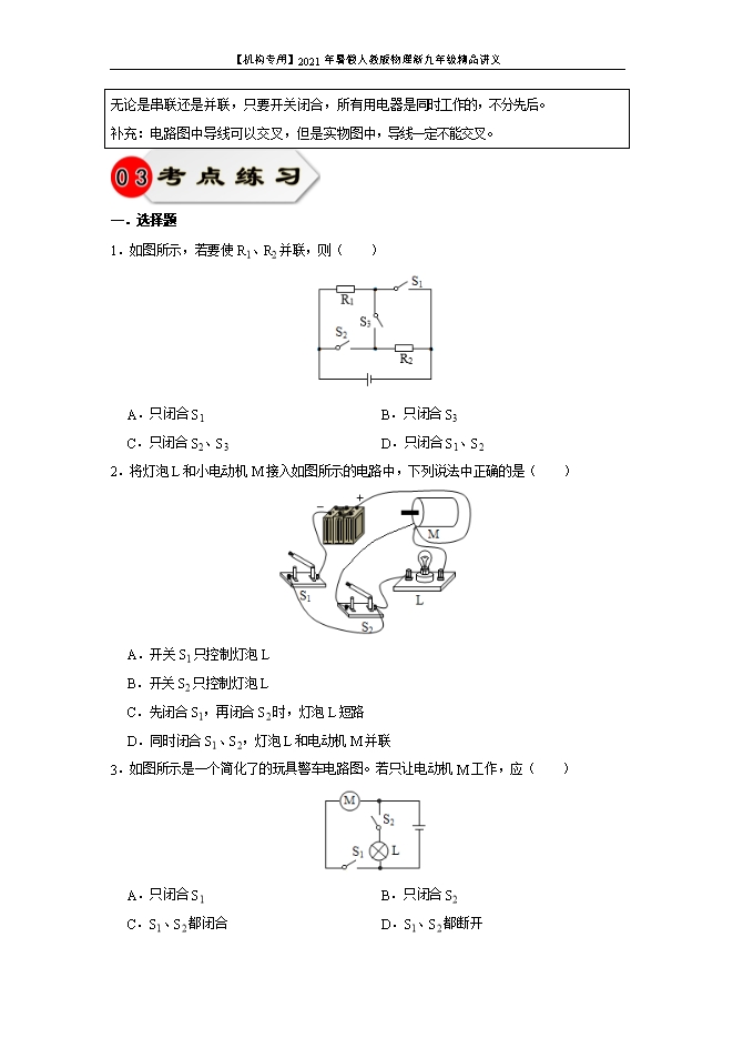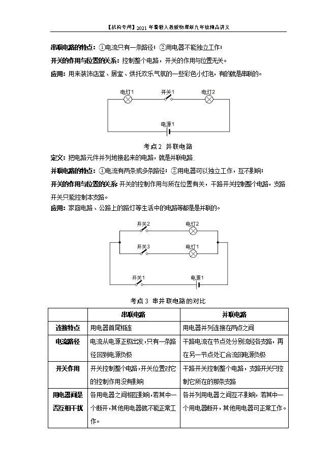 【内容简介】1.串联和并联(1)串联电路定义:把电路元件逐个 ① 连接起来的电路叫做串联电路.电路图: 特点:电流有且只有 ② 条路径;各串联用电器相互制约,一处断路,整个电路都断开;(2)并联电路定义:把元件 ③ 地连接起来组成的电路叫做并联电路.电路图: 特点:电流至少有 ④ 路径;各用电器独立工作,互不影响;注意:不要误以为两个灯泡同时亮,同时灭,就一定是串联电路.其实,若两个灯泡组成并联电路,开关位于干路上,也可以实现两个灯泡同时亮、灭.2.串联电路和并联电路中开关的控制特点:(1)串联电路:开关控制 ⑤ 用电器,开关的位置 ⑥ 它对用电器的控制作用。 (2)并联电路:干路开关控制 ⑦ 用电器,支路开关控制 ⑧ 用电器。 3.生活中的串联和并联电路:(1)家庭中的电灯、电吹风机、电冰箱、电视机、电脑等大多是 ⑨ 在电路中。 (2)装饰居室、烘托欢乐气氛的彩色小灯泡可能是 ⑩ 组合而成。 答案:①顺次 ②1条 ③并列 ④2条 ⑤所有 ⑥不影响 ⑦所有 ⑧所在支路 ⑨并联 ⑩串联 考点1 串联电路定义:把电路元件逐个顺次连接起来的电路,就是串联电路。串联电路的特点:①电流只有一条路径;②用电器不能独立工作;开关的作用与位置的关系:控制整个电路,开关的作用与位置无关。应用:用来装饰店堂、居室、烘托欢乐气氛的一些彩色小灯泡,有的就是串联的。 考点2 并联电路定义:把电路元件并列地接起来的电路,就是并联电路.并联电路的特点:①电流有两条或多条路径;②用电器可以独立工作,互不影响;开关的作用与位置的关系:开关的控制作用与所在位置有关,干路开关控制整个电路,支路开关只能控制本支路。应用:家庭电路、公路上的路灯等生活中的电路等都是是并联的。 考点3 串并联电路的对比串联电路并联电路连接特点用电器首尾相连用电器并列连接在两点之间电流路径电流从电源正极出发,只有一条路径回到电源负极干路电流在节点处分别流经各支路,再在另一节点处汇合流回电源负极开关作用开关控制整个电路,开关位置对它的控制作用没有影响干路开关控制整个电路,支路开关只控制它所在的那条支路用电器间是否互相干扰各用电器之间相互影响,若其中一个断开,其他用电器就不能正常工作。各并列用电器之间互不影响,若其中一个用电器断开,其他用电器可正常工作。