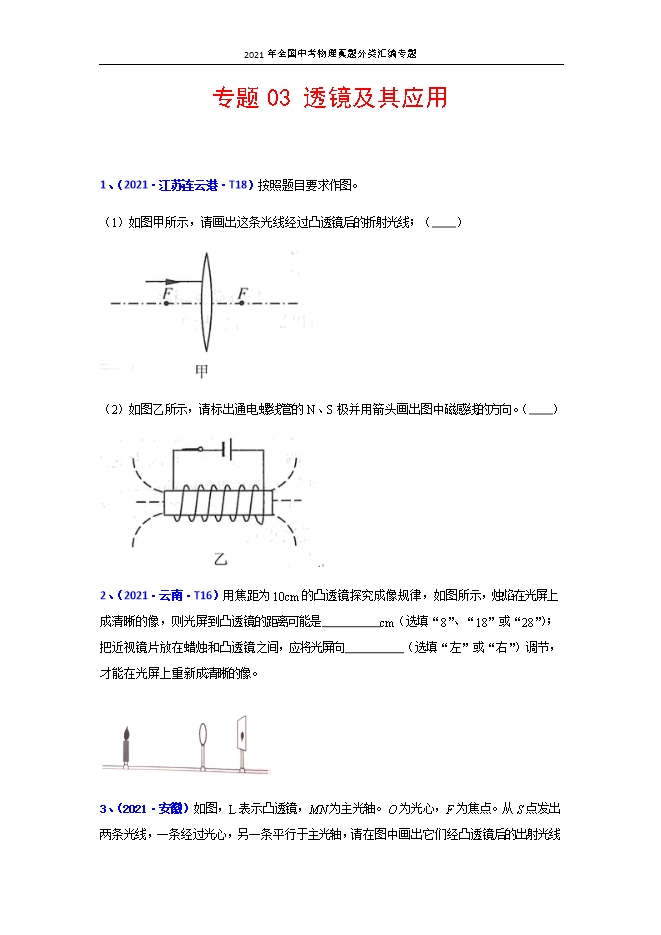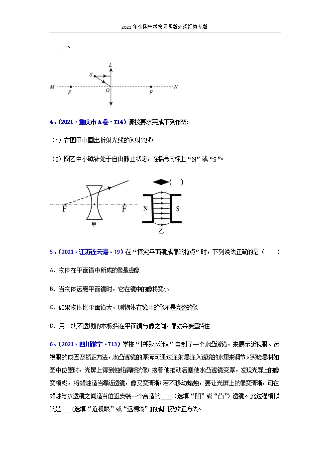 【内容简介】1、(2021•江苏连云港•T18)按照题目要求作图。(1)如图甲所示,请画出这条光线经过凸透镜后的折射光线;(____) (2)如图乙所示,请标出通电螺线管的N、S极并用箭头画出图中磁感线的方向。(____) 2、(2021•云南•T16)用焦距为10cm的凸透镜探究成像规律,如图所示,烛焰在光屏上成清晰的像,则光屏到凸透镜的距离可能是__________cm(选填“8”、“18”或“28”);把近视镜片放在蜡烛和凸透镜之间,应将光屏向__________(选填“左”或“右”)调节,才能在光屏上重新成清晰的像。 3、(2021•安徽)如图,L表示凸透镜,MN为主光轴。O为光心,F为焦点。从S点发出两条光线,一条经过光心,另一条平行于主光轴,请在图中画出它们经凸透镜后的出射光线______。 4、(2021•重庆市A卷•T14)请按要求完成下列作图:(1)在图甲中画出折射光线的入射光线;(2)图乙中小磁针处于自由静止状态,在括号内标上“N”或“S”。 5、(2021•江苏连云港•T9)在“探究平面镜成像的特点”时,下列说法正确的是( )A.物体在平面镜中所成的像是虚像B.当物体远离平面镜时,它在镜中的像将变小C.如果物体比平面镜大,则物体在镜中的像不是完整的像D.用一块不透明的木板挡在平面镜与像之间,像就会被遮挡住6、(2021•四川遂宁•T13)学校“护眼小分队”自制了一个水凸透镜,来展示近视眼、远视眼的成因及矫正方法,水凸透镜的厚薄可通过注射器注入透镜的水量来调节。实验器材如图中位置时,光屏上得到烛焰清晰的像;接着他推动活塞使水凸透镜变厚,发现光屏上的像变模糊,将蜡烛适当靠近透镜,像又变清晰;若不移动蜡烛,要让光屏上的像变清晰,可在蜡烛与水透镜之间适当位置安装一个合适的 (选填“凹”或“凸”)透镜。此过程模拟的是 (选填“近视眼”或“远视眼”)的成因及矫正方法。