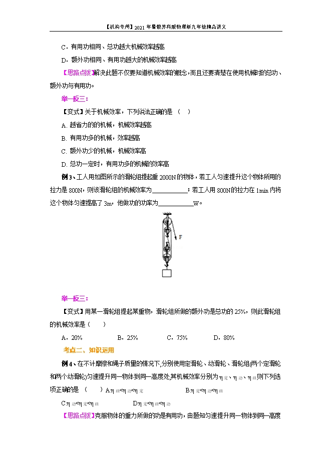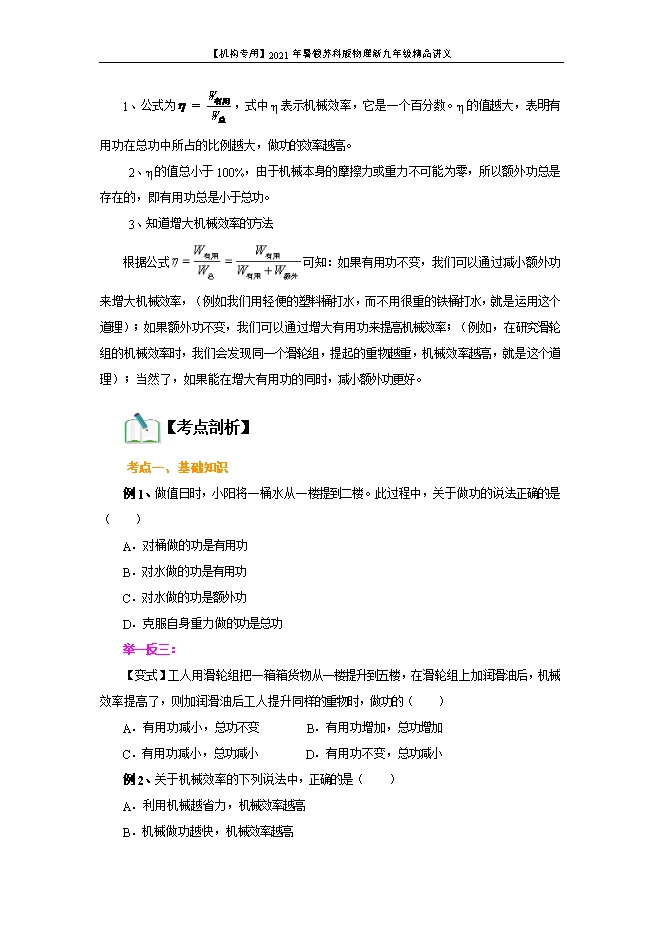 【内容简介】知识点一、有用功、额外功、总功1、功的原理:使用机械时,人们所做的功,都不会少于直接用手所做的功,也就是使用任何机械都不省功。 在理想情况下,使用机械所做的功等于不使用机械所作的功。 在实际情况中,使用机械所做的功大于不使用机械所作的功。2、有用功:为了达到某一目的而必须做的功。如提沙子上楼时对沙子做的功就是有用功。利用机械工作时对工作目的物做的功叫有用功。3、额外功:对人们完成某件事情来说没有用,但又不得不做的功,如提沙子上楼时对桶、滑轮等做的功就是额外功。4、总功:使用机械时,动力做的功,例如:用桶从井中打水。由于工作目的是水,所以对水做的功是有用功,对桶做的功是额外功,人在整个提水过程中做的功是总功。知识点诠释: 1、总功是有用功与额外功之和,即W有用+W额外=W总。2、额外功的产生是因为利用机械做功时,除了对工作目的物做功外,还要克服机械本身的摩擦力或重力做功。知识点二、机械效率为了表示有用功在总功中所占的比例,物理学中引入了机械效率,它等于有用功W有用与总功W总之比,符号为η。知识点诠释: 1、公式为 ,式中η表示机械效率,它是一个百分数。η的值越大,表明有用功在总功中所占的比例越大,做功的效率越高。 2、η的值总小于100%,由于机械本身的摩擦力或重力不可能为零,所以额外功总是存在的,即有用功总是小于总功。 3、知道增大机械效率的方法 根据公式 可知:如果有用功不变,我们可以通过减小额外功来增大机械效率,(例如我们用轻便的塑料桶打水,而不用很重的铁桶打水,就是运用这个道理);如果额外功不变,我们可以通过增大有用功来提高机械效率;(例如,在研究滑轮组的机械效率时,我们会发现同一个滑轮组,提起的重物越重,机械效率越高,就是这个道理);当然了,如果能在增大有用功的同时,减小额外功更好。 【考点剖析】考点一、基础知识例1、做值日时,小阳将一桶水从一楼提到二楼。此过程中,关于做功的说法正确的是( )A.对桶做的功是有用功B.对水做的功是有用功 C.对水做的功是额外功 D.克服自身重力做的功是总功【答案】B【解析】小阳目的是提水,对水做的功为有用功,故B正确、C错;对桶做的功为额外功,故A错;小阳把水、桶、自身提升做的功为总功,故D错。【总结升华】本题考查了学生对有用功、总功、额外功的了解与掌握,区分时要从我们的目的出发分析判断。举一反三:【变式】工人用滑轮组把一箱箱货物从一楼提升到五楼,在滑轮组上加润滑油后,机械效率提高了,则加润滑油后工人提升同样的重物时,做功的( )A.有用功减小,总功不变 B.有用功增加,总功增加C.有用功减小,总功减小 D.有用功不变,总功减小【答案】D例2、关于机械效率的下列说法中,正确的是( )A.利用机械越省力,机械效率越高 B.机械做功越快,机械效率越高 C.有用功相同、总功越大机械效率越高 D.额外功相同、有用功越大的机械效率越高 【思路点拨】解决此题不仅要知道机械效率的概念,而且还要清楚在使用机械时的总功、额外功与有用功。【答案】D