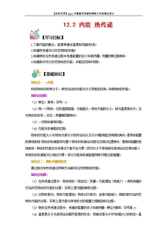 12.2 内能 热传递--【机构专用】2021年暑假苏科版物理新九年级精品讲义(教师版和学生版)