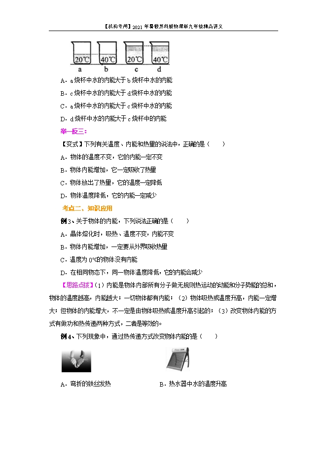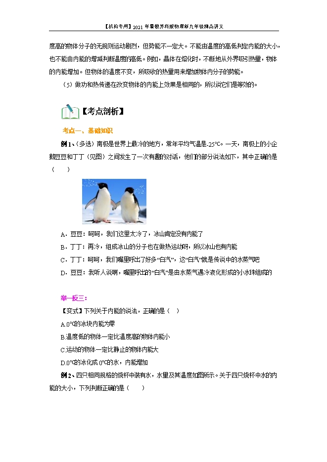 【内容简介】知识点一 、内能构成物体的所有分子,其热运动的动能与分子势能的总和,叫做物体的内能。知识点诠释: (1)单位:焦耳,符号:J。(2)同一个物体,它的温度越高,内能越大。物体内能的大小,除与温度有关外,还与物体的体积、状态、质量等因素有关。(3)一切物体都有内能。(4)内能与机械能的区别: 物体的内能大小与物体内部分子的热运动以及分子间的相互作用情况有关,是物体能量的微观表现;物体的机械能则与整个物体的机械运动情况及相对位置有关,是物体能量的宏观表现。物体的内能在任何情况下都不会为零(因为分子不停地做无规则运动总有动能),而物体的机械能可以相对为零。所以内能和机械能是两种不同形式的能量。知识点二、物体内能的改变通过做功和热传递这两种方法都可以改变物体的内能。知识点诠释: (1)在热传递过程中,物体吸收(或放出)热量。内能增加(或减少)。用热传递的方法改变物体的内能的过程,实质上是内能的转移过程。(2)对物体做功,物体内能增加;物体对外做功,自身内能减少,用做功的方法改变物体内能的过程,实质上是内能与其他形式的能量之间相互转化过程。(3)物体在热传递过程中,传递的能量的多少叫做热量。单位为焦耳,符号是J。(4)温度是分子无规则运动剧烈程度的标志,或者说是分子平均动能大小的标志。温度高的物体分子的无规则运动剧烈,但势能不一定大。不能由温度的高低判定内能的大小,也不能由内能的增减判断温度的高低。例如,晶体在熔化时,不断地从外界吸引热量,物体的内能增加。但物体的温度不变,所吸收的热量用来增加物体内分子的势能。(5)做功和热传递在改变物体的内能上效果是相同的,所以说它们是等效的。 【考点剖析】考点一、基础知识例1、(多选)南极是世界上最冷的地方,常年平均气温是-25℃。一天,南极上的小企鹅豆豆和丁丁(见图)之间发生了一次有趣的对话,他们的部分说法如下,其中正确的是 ( ) A.豆豆:呵呵,我们这里太冷了,冰山肯定没有内能了B.丁丁:再冷,组成冰山的分子也在做热运动呀,所以冰山也有内能 C.丁丁:呵呵,我们嘴里呼出了好多“白汽”,这“白汽”就是传说中的水蒸气吧 D.豆豆:我听人说啊,嘴里呼出的“白汽”是由水蒸气遇冷液化形成的小水珠组成的【思路点拨】知道一切物体都有内能;了解人们常看到的“白烟”、“白汽”形成的原因,及其对应的的物态变化过程。【答案】BD【解析】一切物体都有内能,所以A选项说法错误,不符合题意。B选项说法正确,符合题意。嘴里呼出的“白汽”是由水蒸气遇冷液化形成的小水珠组成的。“白汽”是液态的,水蒸气是气态的,所以C选项说法错误,不符合题意。D选项说法正确,符合题意。【总结升华】此题综合考查了内能的概念和物态变化的液化现象,带有童话色彩,能激发同学们学习物理的兴趣。
