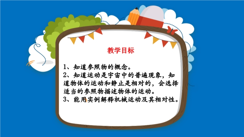 【内容简介】本节内容由“机械运动”和“参照物”两部分内容组成。运动是自然界中的普遍现象,宇宙中的万物都处于永恒的运动之中,其中机械运动是自然界最简单、最基本的运动形式,是学习其他各种运动的基础,也是进一步学习“速度”、“运动和力的关系”的必备知识。运动和静止的相对性是本节的重点和难点。课本内容学习使学生体验类似的场景,使学生体验到:对于同一个物体,由于参照物的选择不同得到的运动状态可能不同,建立唯物主义世界观。运动对于学生而言并不陌生,学生对运动有不同程度的了解。但学生意识中的运动一般限于相对于地面位置改变的运动物体,可以说是绝对运动,比如路上奔驰的汽车、行人等,对于运动的相对性缺乏必要的认识。本节的学习目的让学生认识到物体的运动与静止是相对的,并且能借助参照物判断物体的运动状态。物理观念1.知道机械运动的含义及参照物的概念。2.认识宇宙中的一切事物都处于永恒的运动之中,知道运动的相对性。科学思维通过对大量生活事例的观察、讨论和分析,认识机械运动及其相对性,提高观察能力和分析问题的能力,学习从具体现象中归纳出物理概念和规律的方法。科学探究能根据生活现象提出有关运动及其相对性问题并能用实例解释。科学态度与责任1.通过学习自然界运动形式的多样性,树立“物质是运动的”辩证唯物主义世界观。2.通过学习运动的相对性知识在现代科技中的应用,初步认识科学技术对人类的影响,进一步增强对科学的热爱。机械运动、参照物概念,运动和静止的相对性。