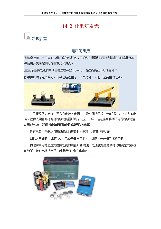 14.2 让电灯发光--【辅导专用】2021年暑假沪科版物理新九年级精品讲义(教师版和学生版)