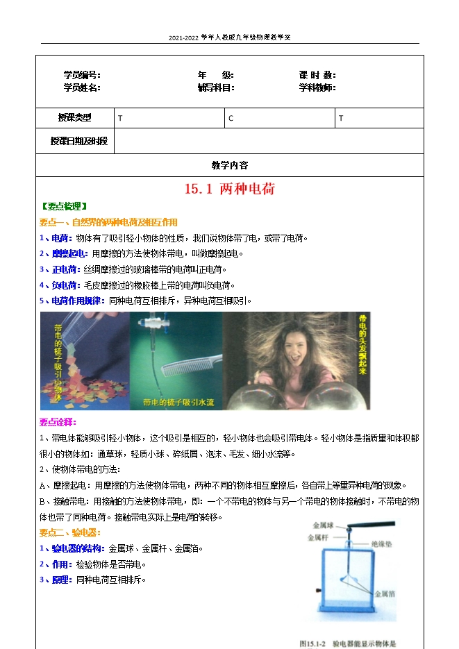 【辅导专用】15.1 两种电荷--2021-2022学年人教版九年级物理教学案(学生版和教师版)