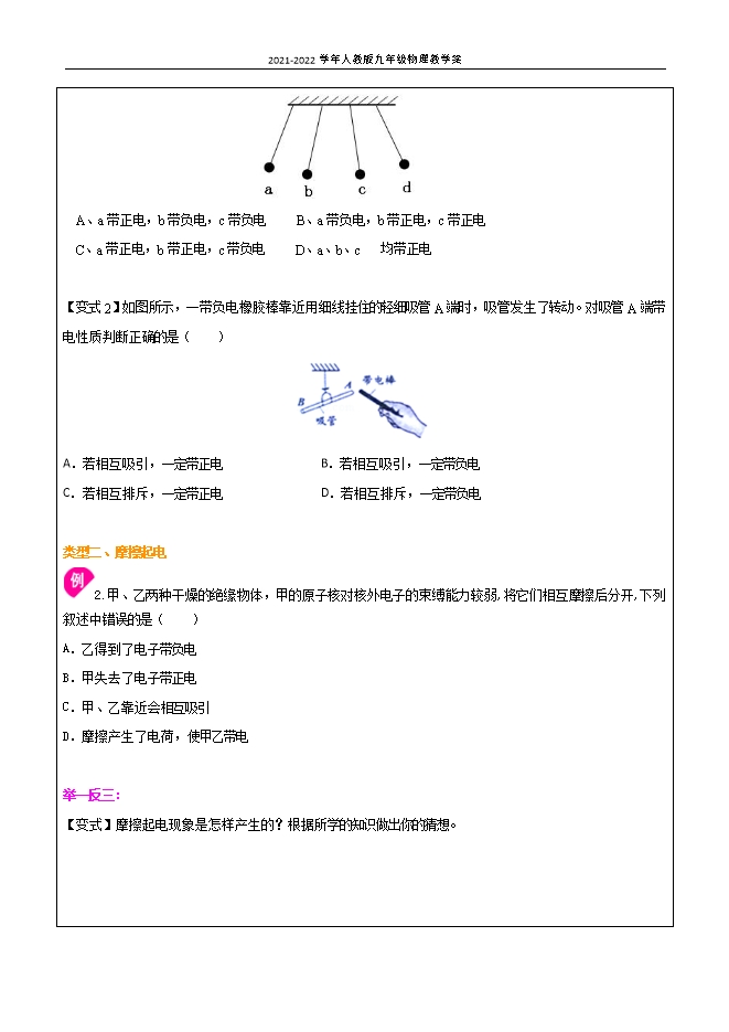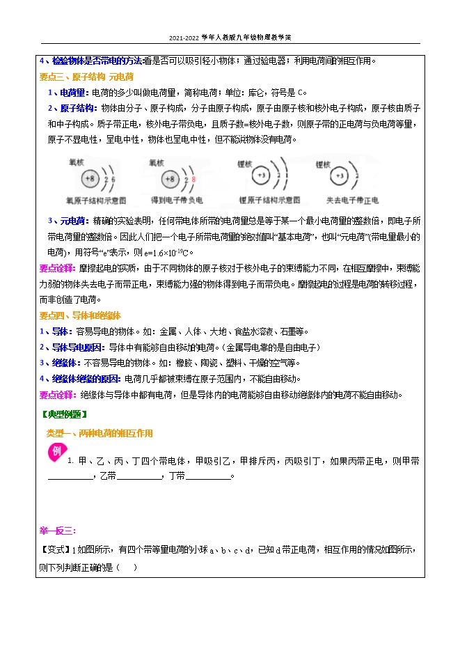 【内容简介】要点一、自然界的两种电荷及相互作用1、电荷:物体有了吸引轻小物体的性质,我们说物体带了电,或带了电荷。2、摩擦起电:用摩擦的方法使物体带电,叫做摩擦起电。 3、正电荷:丝绸摩擦过的玻璃棒带的电荷叫正电荷。4、负电荷:毛皮摩擦过的橡胶棒上带的电荷叫负电荷。5、电荷作用规律:同种电荷互相排斥,异种电荷互相吸引。 要点诠释:1、带电体能够吸引轻小物体,这个吸引是相互的,轻小物体也会吸引带电体。轻小物体是指质量和体积都很小的物体如:通草球,轻质小球、碎纸屑、泡沫、毛发、细小水流等。2、使物体带电的方法:A、摩擦起电:用摩擦的方法使物体带电,两种不同的物体相互摩擦后,各自带上等量异种电荷的现象。B、接触带电:用接触的方法使物体带电,即:一个不带电的物体与另一个带电的物体接触时,不带电的物体也带了同种电荷。接触带电实际上是电荷的转移。要点二、验电器:1、验电器的结构:金属球、金属杆、金属箔。2、作用:检验物体是否带电。3、原理:同种电荷互相排斥。4、检验物体是否带电的方法:看是否可以吸引轻小物体;通过验电器;利用电荷间的相互作用。要点三、原子结构 元电荷 1、电荷量:电荷的多少叫做电荷量,简称电荷;单位:库仑,符号是C。2、原子结构:物体由分子、原子构成,分子由原子构成,原子由原子核和核外电子构成,原子核由质子和中子构成。质子带正电,核外电子带负电,且质子数=核外电子数,则原子带的正电荷与负电荷等量,原子不显电性,呈电中性,物体也呈电中性,但不能说物体没有电荷。 3、元电荷:精确的实验表明,任何带电体所带的电荷量总是等于某一个最小电荷量的整数倍,即电子所带电荷量的整数倍。因此人们把一个电子所带电荷量的绝对值叫“基本电荷”,也叫“元电荷”(带电量最小的电荷),用符号“e”表示,则e=1.6×10-19C。要点诠释:摩擦起电的实质,由于不同物体的原子核对于核外电子的束缚能力不同,在相互摩擦中,束缚能力弱的物体失去电子而带正电,束缚能力强的物体得到电子而带负电。摩擦起电的过程是电荷的转移过程,而非创造了电荷。要点四、导体和绝缘体1、导体:容易导电的物体。如:金属、人体、大地、食盐水溶液、石墨等。2、导体导电原因:导体中有能够自由移动的电荷。(金属导电靠的是自由电子)3、绝缘体:不容易导电的物体。如:橡胶、陶瓷、塑料、干燥的空气等。4、绝缘体绝缘的原因:电荷几乎都被束缚在原子范围内,不能自由移动。 要点诠释:绝缘体与导体中都有电荷,但是导体内的电荷能够自由移动绝缘体内的电荷不能自由移动。【典型例题】类型一、两种电荷的相互作用 1. 甲、乙、丙、丁四个带电体,甲吸引乙,甲排斥丙,丙吸引丁,如果丙带正电,则甲带 ___________,乙带___________,丁带___________。【思路点拨】自然界只存在两种电荷,一种是正电荷,一种是负电荷,异种电荷相互吸引,同种电荷相互排斥。【答案】正电;负电;负电【解析】因为甲、乙、丙、丁四个带电体发生如上所述的相互作用,且丙带正电,丙吸引丁,故丁带负电;