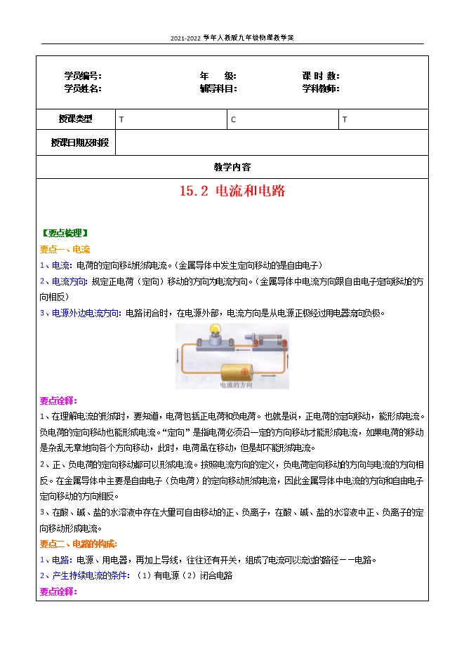 【辅导专用】15.2 电流和电路--2021-2022学年人教版九年级物理教学案(学生版和教师版)