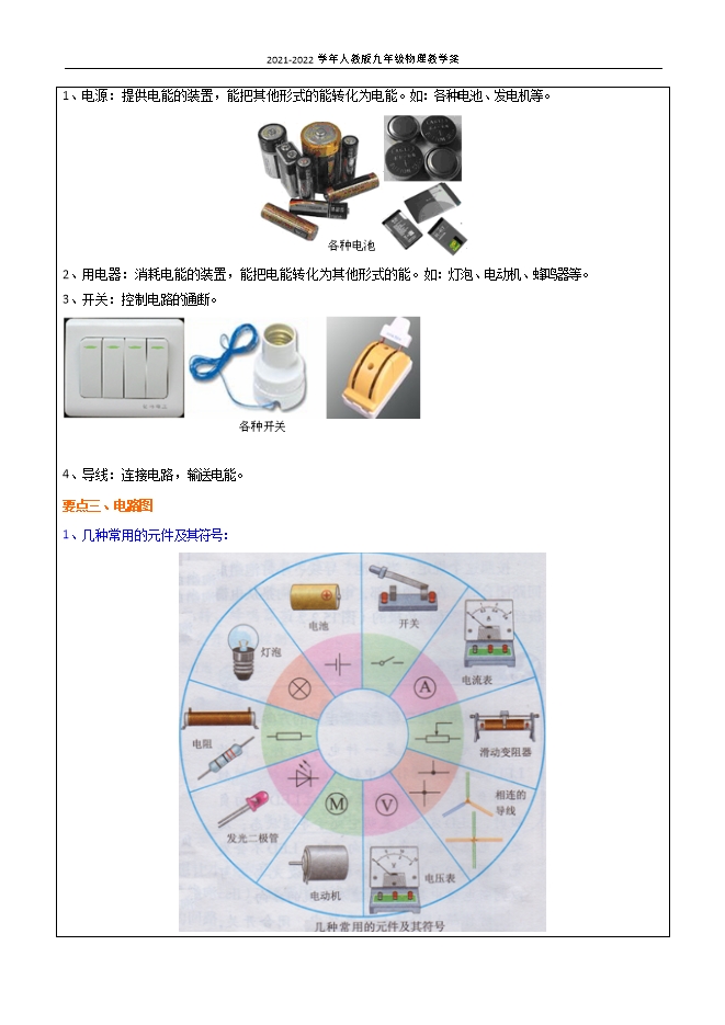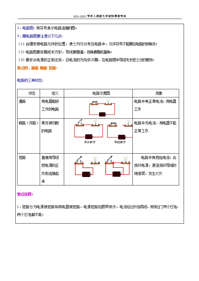 【内容简介】要点一、电流1、电流:电荷的定向移动形成电流。(金属导体中发生定向移动的是自由电子)2、电流方向:规定正电荷(定向)移动的方向为电流方向。(金属导体中电流方向跟自由电子定向移动的方向相反)3、电源外边电流方向:电路闭合时,在电源外部,电流方向是从电源正极经过用电器流向负极。 要点诠释:1、在理解电流的形成时,要知道,电荷包括正电荷和负电荷。也就是说,正电荷的定向移动,能形成电流。负电荷的定向移动也能形成电流。“定向”是指电荷必须沿一定的方向移动才能形成电流,如果电荷的移动是杂乱无章地向各个方向移动,此时,电荷虽在移动,但是却不能形成电流。2、正、负电荷的定向移动都可以形成电流。按照电流方向的定义,负电荷定向移动的方向与电流的方向相反。在金属导体中主要是自由电子(负电荷)的定向移动形成电流,因此金属导体中电流的方向和自由电子定向移动的方向相反。3、在酸、碱、盐的水溶液中存在大量可自由移动的正、负离子,在酸、碱、盐的水溶液中正、负离子的定向移动形成电流。要点二、电路的构成: 1、电路:电源、用电器,再加上导线,往往还有开关,组成了电流可以流过的路径——电路。2、产生持续电流的条件:(1)有电源(2)闭合电路要点诠释:1、电源:提供电能的装置,能把其他形式的能转化为电能。如:各种电池、发电机等。 2、用电器:消耗电能的装置,能把电能转化为其他形式的能。如:灯泡、电动机、蜂鸣器等。3、开关:控制电路的通断。 4、导线:连接电路,输送电能。要点三、电路图1、几种常用的元件及其符号: 2、电路图:用符号表示电路连接的图。3、画电路图要注意以下几点:(1)合理安排电路元件的位置,使之均匀分布在电路中,元件符号不能画在电路的拐角处;(2)电路图最好画成长方形,导线要画直,拐角要画成直角;(3)最好从电源的正极出发,沿电流的方向依次画,在电路图中导线无长短之分的原则。要点四、通路 断路 短路: