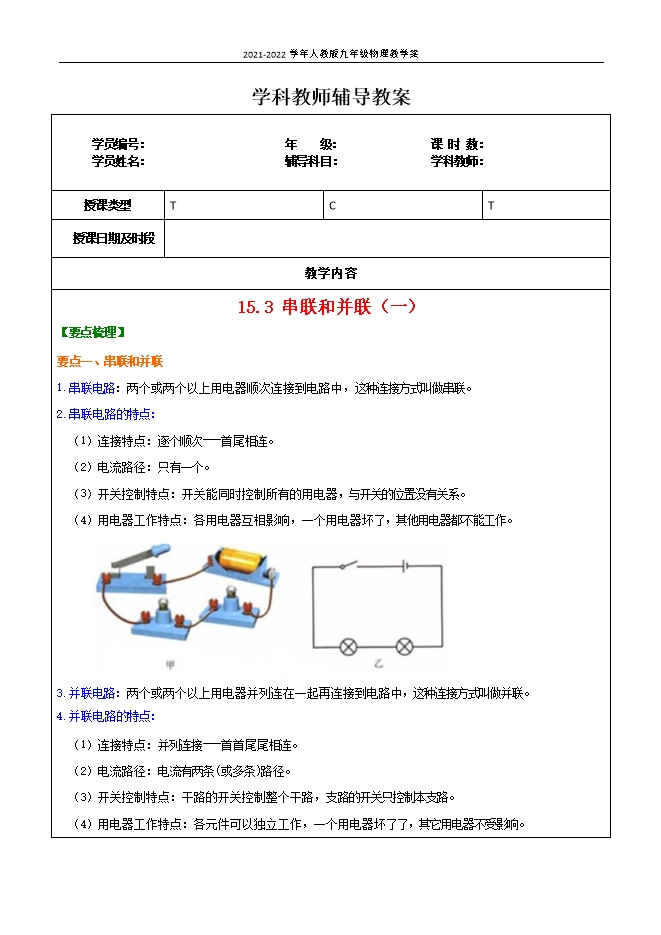 【辅导专用】15.3 串联和并联--2021-2022学年人教版九年级物理教学案(学生版和教师版)