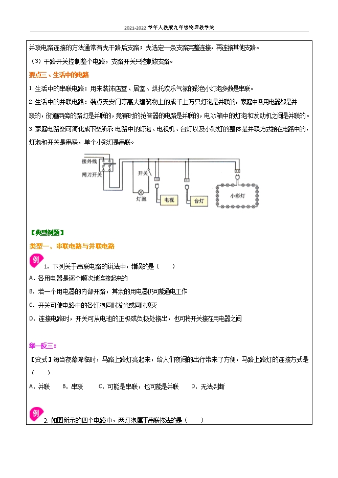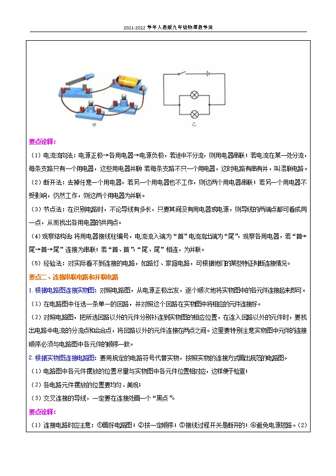 【内容简介】要点一、串联和并联1.串联电路:两个或两个以上用电器顺次连接到电路中,这种连接方式叫做串联。2.串联电路的特点:(1)连接特点:逐个顺次---首尾相连。(2)电流路径:只有一个。(3)开关控制特点:开关能同时控制所有的用电器,与开关的位置没有关系。(4)用电器工作特点:各用电器互相影响,一个用电器坏了,其他用电器都不能工作。 3.并联电路:两个或两个以上用电器并列连在一起再连接到电路中,这种连接方式叫做并联。4.并联电路的特点: (1)连接特点:并列连接---首首尾尾相连。(2)电流路径:电流有两条(或多条)路径。 (3)开关控制特点:干路的开关控制整个干路,支路的开关只控制本支路。 (4)用电器工作特点:各元件可以独立工作,一个用电器坏了了,其它用电器不受影响。 要点诠释:(1)电流流向法:电源正极→各用电器→电源负极,若途中不分流,则用电器串联;若电流在某一处分流,每条支路只有一个用电器,这些用电器并联;若每条支路不只一个用电器,这时电路有串有并,叫混联电路。(2)断开法:去掉任意一个用电器,若另一个用电器也不工作,则这两个用电器串联;若另一个用电器不受影响,仍然工作,则这两个用电器为并联。(3)节点法:在识别电路时,不论导线有多长,只要其间没有用电器或电源,则导线的两端点都可看成同一点,从而找出各用电器的共同点。(4)观察结构法:将用电器接线柱编号,电流流入端为“首”电流流出端为“尾”,观察各用电器,若“首→尾→首→尾”连接为串联;若“首、首”,“尾、尾”相连,为并联。(5)经验法:对实际看不到连接的电路,如路灯、家庭电路,可根据他们的某些特征判断连接情况。要点二、连接串联电路和并联电路1.根据电路图连接实物图:对照电路图,从电源正极出发,逐个顺次地将实物图中的各元件连接起来即可。(1)在电路图中任选一条单一的回路,并对照这个回路在实物图中将相应的元件连接好。(2)对照电路图,把所选回路以外的元件分别补连到实物图的相应位置,在连入回路以外的元件时,要找出电路中电流的分流点和会合点,将回路以外的元件连接在两点之间。这里要特别注意实物图中元件的连接顺序必须与电路图中各元件的顺序一致。 2.根据实物图连接电路图:要用规定的电路符号代替实物,按照实物的连接方式画出规范的电路图。(1)电路图中各元件摆放的位置尽量与实物图中各元件位置相对应,这样便于检查;(2)各电路元件摆放的位置要均匀、美观;