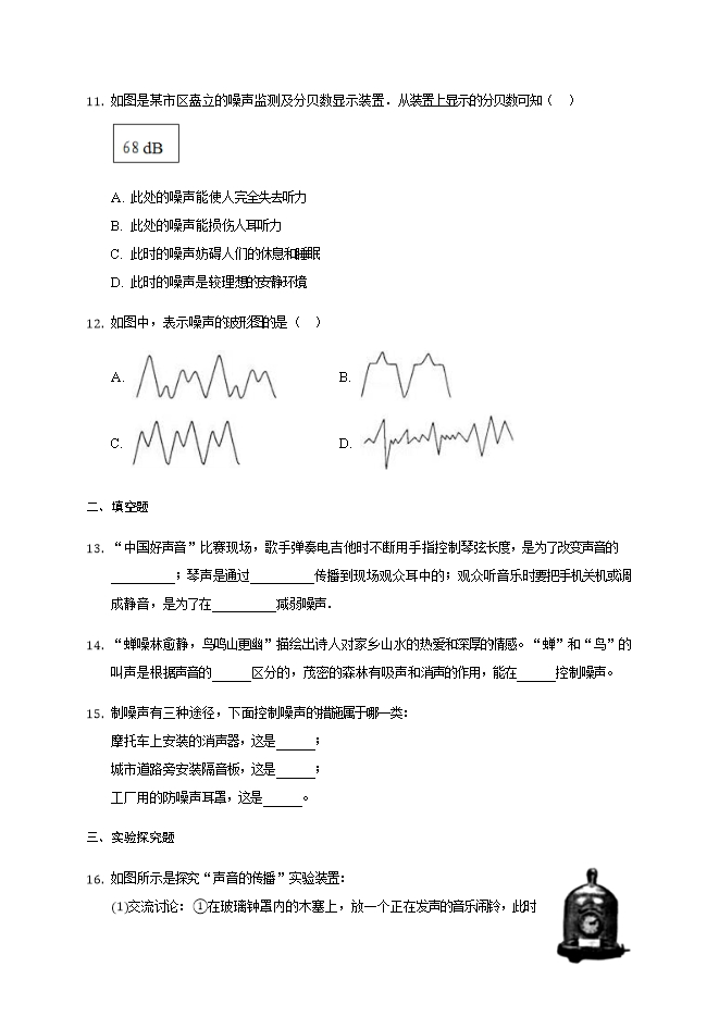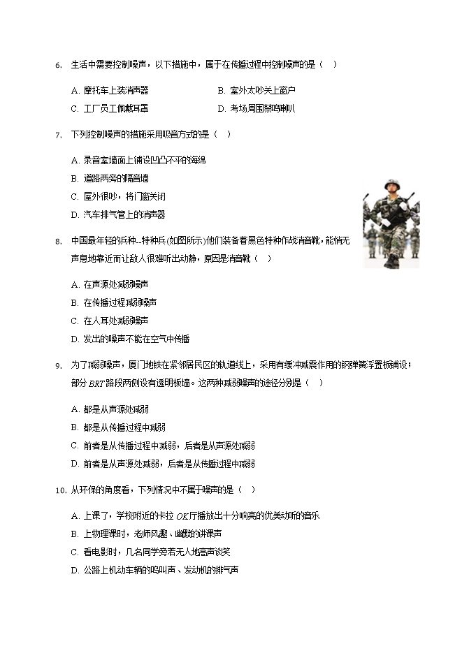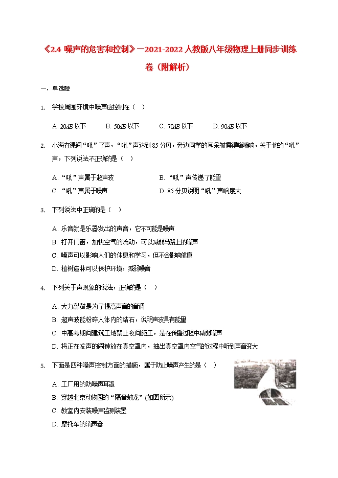 【内容简介】学校周围环境中噪声应控制在( )A. 20dB以下B. 50dB以下C. 70dB以下D. 90dB以下小海在课间“吼”了声,“吼”声达到85分贝,旁边同学的耳朵被震得嗡嗡响,关于他的“吼”声,下列说法不正确的是( )A. “吼”声属于超声波B. “吼”声传递了能量C. “吼”声属于噪声D. 85分贝说明“吼”声响度大下列说法中正确的是( )A. 乐音就是乐器发出的声音,它不可能是噪声B. 打开门窗,加快空气的流动,可以减弱马路上的噪声C. 噪声可以影响人们的休息和学习,但不会影响健康D. 植树造林可以保护环境,减弱噪音下列关于声现象的说法,正确的是( )A. 大力敲鼓是为了提高声音的音调B. 超声波能粉碎人体内的结石,说明声波具有能量C. 中高考期间建筑工地禁止夜间施工,是在传播过程中减弱噪声D. 将正在发声的闹钟放在真空罩内,抽出真空罩内空气的过程中听到声音变大下面是四种噪声控制方面的措施,属于防止噪声产生的是( )A. 工厂用的防噪声耳罩B. 穿越北京动物园的“隔音蛟龙”(如图所示)C. 教室内安装噪声监测装置D. 摩托车的消声器生活中需要控制噪声,以下措施中,属于在传播过程中控制噪声的是( )A. 摩托车上装消声器B. 室外太吵关上窗户C. 工厂员工佩戴耳罩D. 考场周围禁鸣喇叭下列控制噪声的措施采用吸音方式的是( )A. 录音室墙面上铺设凹凸不平的海绵B. 道路两旁的隔音墙C. 屋外很吵,将门窗关闭D. 汽车排气管上的消声器中国最年轻的兵种--特种兵(如图所示)他们装备着黑色特种作战消音靴,能悄无声息地靠近而让敌人很难听出动静,原因是消音靴( )A. 在声源处减弱噪声B. 在传播过程减弱噪声C. 在人耳处减弱噪声D. 发出的噪声不能在空气中传播为了减弱噪声,厦门地铁在紧邻居民区的轨道线上,采用有缓冲减震作用的钢弹簧浮置板铺设;部分BRT路段两侧设有透明板墙。这两种减弱噪声的途径分别是( )A. 都是从声源处减弱B. 都是从传播过程中减弱C. 前者是从传播过程中减弱,后者是从声源处减弱D. 前者是从声源处减弱,后者是从传播过程中减弱从环保的角度看,下列情况中不属于噪声的是( )A. 上课了,学校附近的卡拉OK厅播放出十分响亮的优美动听的音乐B. 上物理课时,老师风趣、幽默的讲课声C. 看电影时,几名同学旁若无人地高声谈笑D. 公路上机动车辆的鸣叫声、发动机的排气声