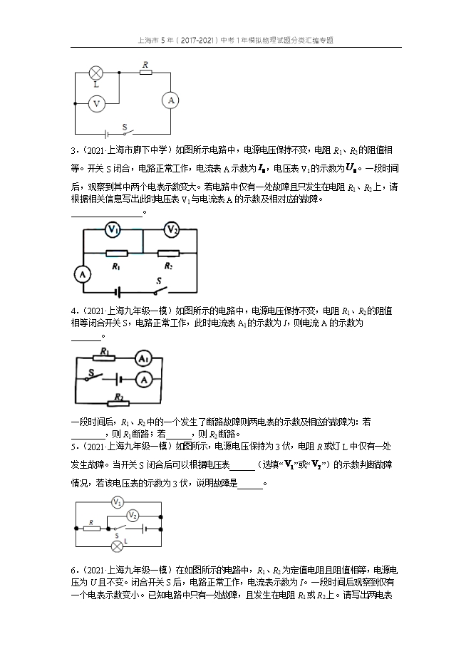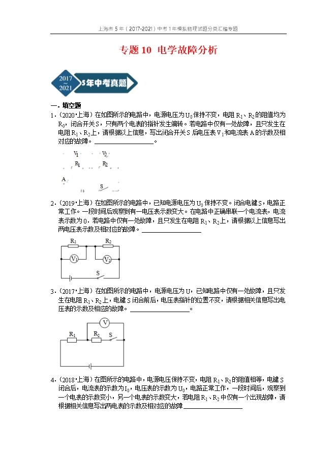 专题10 电学故障分析--上海市5年(2017-2021)中考1年模拟物理试题分类汇编专题(原卷版和解析版)