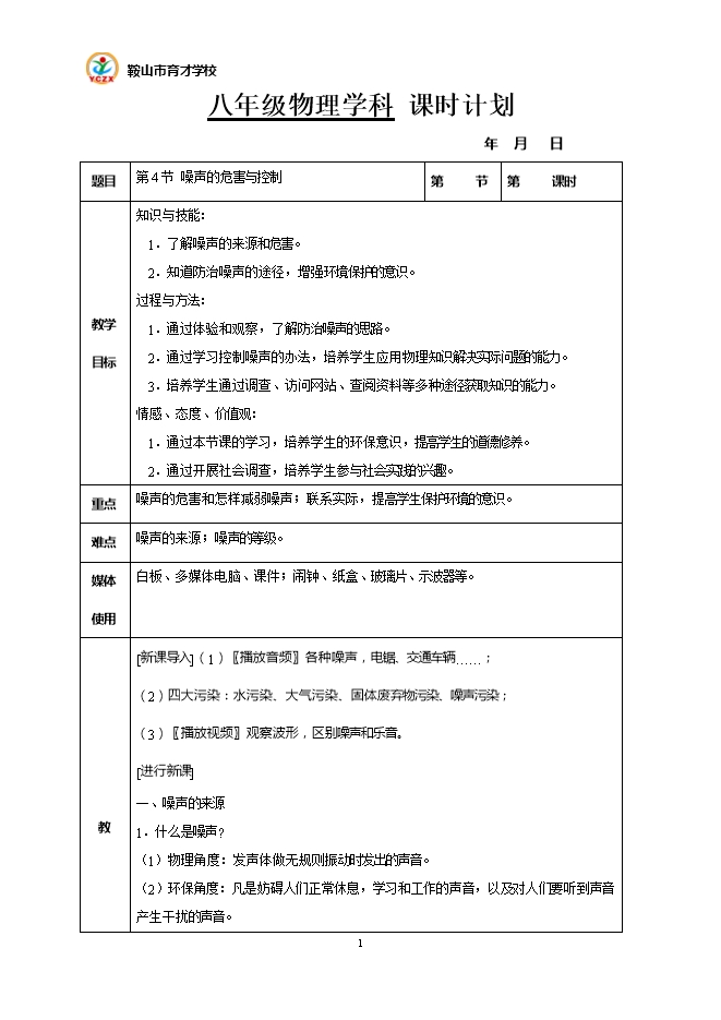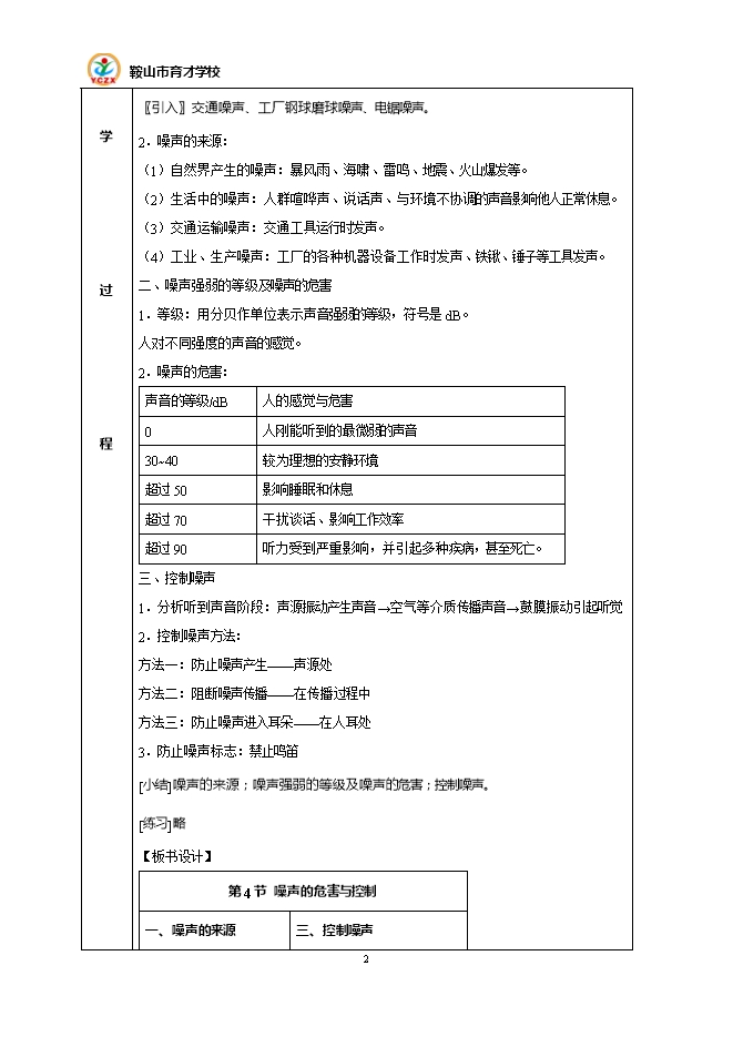 2.4噪声的危害与控制--2021秋辽宁省鞍山市育才中学人教版八年级物理上册教学设计