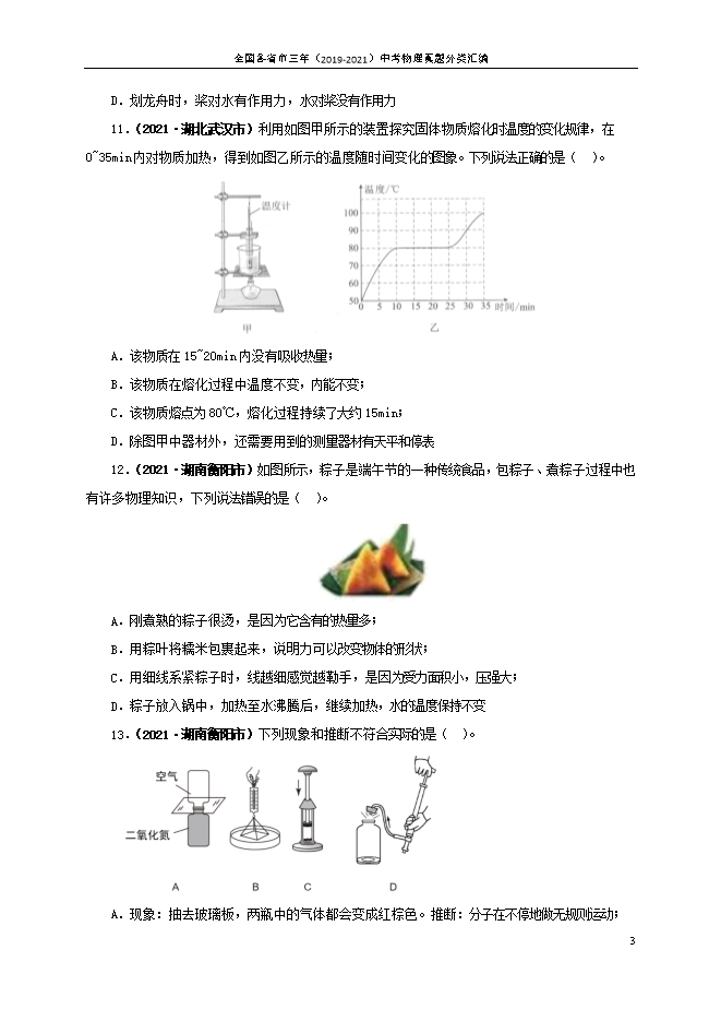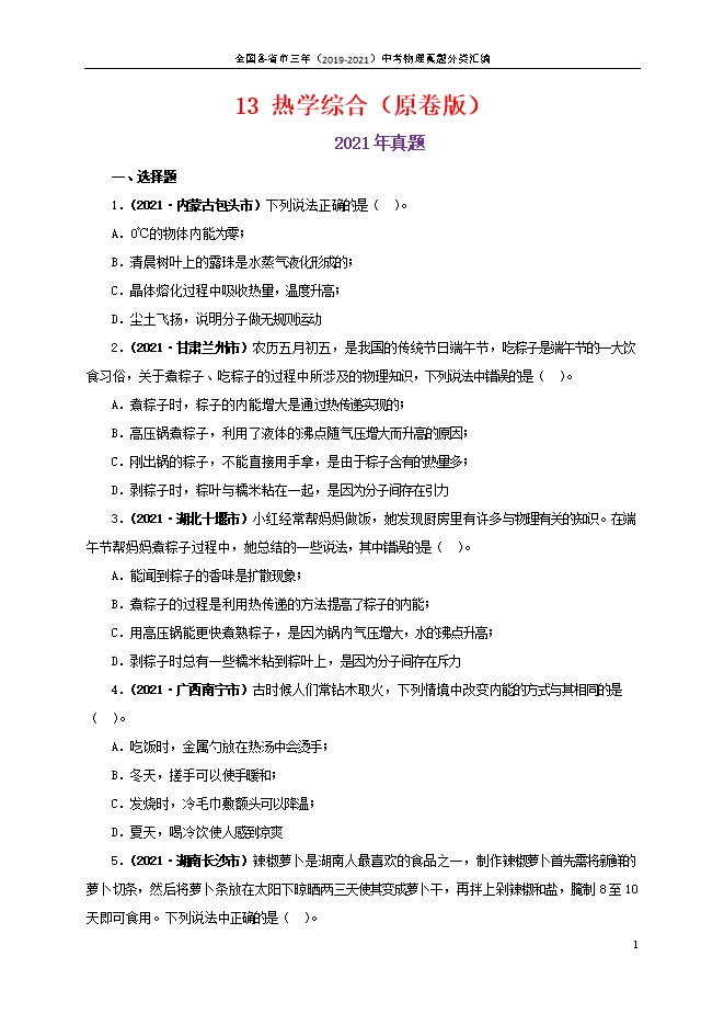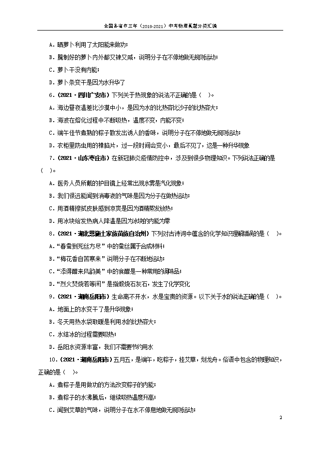 【内容简介】1.(2021·内蒙古包头市)下列说法正确的是( )。A.0℃的物体内能为零;B.清晨树叶上的露珠是水蒸气液化形成的;C.晶体熔化过程中吸收热量,温度升高;D.尘土飞扬,说明分子做无规则运动【答案】B。【解析】A.一切物体都有内能,0℃的物体也有内能,内能不为零,故A错误;B.清晨树叶上的露珠是空气中的水蒸气遇冷液化形成的,故B正确;C.晶体熔化过程中需要继续吸收热量,但温度不再升高,内能增加,故C错误; D.尘土不是单个的分子,它是许多分子的集合体,尘土飞扬,不能说明分子做无规则运动,分子的无规则运动是肉眼看不到的,故D错误。故选B。2.(2021·甘肃兰州市)农历五月初五,是我国的传统节日端午节,吃粽子是端午节的一大饮食习俗,关于煮粽子、吃粽子的过程中所涉及的物理知识,下列说法中错误的是( )。A.煮粽子时,粽子的内能增大是通过热传递实现的;B.高压锅煮粽子,利用了液体的沸点随气压增大而升高的原因;C.刚出锅的粽子,不能直接用手拿,是由于粽子含有的热量多;D.剥粽子时,粽叶与糯米粘在一起,是因为分子间存在引力【答案】C。【解析】A.煮粽子的过程是利用热传递的方法提高了粽子的内能,故A正确,不符合题意;B.利用高压锅更快煮熟粽子,是因为锅内气压增大,水的沸点升高的原因,故B正确,不符合题意;C.刚出锅的粽子,不能直接用手拿,是因为温度高而烫手,不能说粽子含有热量,故C错误,符合题意;D.剥粽子时,粽叶与糯米粘在一起,是因为分子间存在引力,故D正确,不符合题意。故选C。3.(2021·湖北十堰市)小红经常帮妈妈做饭,她发现厨房里有许多与物理有关的知识。在端午节帮妈妈煮粽子过程中,她总结的一些说法,其中错误的是( )。A.能闻到粽子的香味是扩散现象;B.煮粽子的过程是利用热传递的方法提高了粽子的内能;C.用高压锅能更快煮熟粽子,是因为锅内气压增大,水的沸点升高;D.剥粽子时总有一些糯米粘到粽叶上,是因为分子间存在斥力【答案】D。【解析】A.能闻到粽子的香味是由于分子的无规则运动产生的扩散现象,故A正确,A不符合题意;B.改变物体的内能有两种方法,分别是:做功和热传递。煮粽子的过程是利用热传递的方法提高了粽子的内能,故B正确,故B不符合题意;C.水的沸点与气压有关,气压越高,水的沸点越高。用压锅能更快煮熟粽子,是因为锅内气压增大,水的沸点升高,故C说法正确,故C不符合题意;D.剥粽子时总有一些糯米粘到粽叶上,是因为分子间存在引力,故D错误,D符合题意。故选D。4.(2021·广西南宁市)古时候人们常钻木取火,下列情境中改变内能的方式与其相同的是( )。A.吃饭时,金属勺放在热汤中会烫手;B.冬天,搓手可以使手暖和;C.发烧时,冷毛巾敷额头可以降温;D.夏天,喝冷饮使人感到凉爽【答案】B。【解析】常钻木取火,克服摩擦力做功,将机械能转化为内能,故是通做功的方式改变内能。A.吃饭时,金属勺放在热汤中会烫手,只涉及能量的转移,没有涉及能量的转化,故是热传递的方式改变内能,故A不符合题意;B.冬天,搓手可以使手暖和,克服摩擦力做功,将机械能转化为内能,故是通做功的方式改变内能,故B符合题意;C.发烧时,冷毛巾敷额头可以降温,只涉及能量的转移,没有涉及能量的转化,故是热传递的方式改变内能,故C不符合题意;D.夏天,喝冷饮使人感到凉爽,只涉及能量的转移,没有涉及能量的转化,故是热传递的方式改变内能,故D不符合题意。故选B。5.(2021·湖南长沙市)辣椒萝卜是湖南人最喜欢的食品之一,制作辣椒萝卜首先需将新鲜的萝卜切条,然后将萝卜条放在太阳下晾晒两三天使其变成萝卜干,再拌上剁辣椒和盐,腌制8至10天即可食用。下列说法中正确的是( )。A.晒萝卜利用了太阳能来做功;B.腌制好的萝卜内外都又辣又咸,说明分子在不停地做无规则运动;C.萝卜干没有内能;D.萝卜条变干是因为水升华了【答案】B。【解析】A.萝卜吸收了太阳能,使萝卜温度升高,水分蒸发加快,因此晒萝卜利用了太阳能来进行热传递,故A错误;B.腌制好的萝卜内外都又辣又咸,是辣椒和盐扩散进了萝卜干,说明分子在不停地做无规则运动,故B正确;C.一切物体都有内能,萝卜干也有内能,故C错误;D.萝卜条变干是因为水蒸发了,是汽化现象,故D错误。故选B。